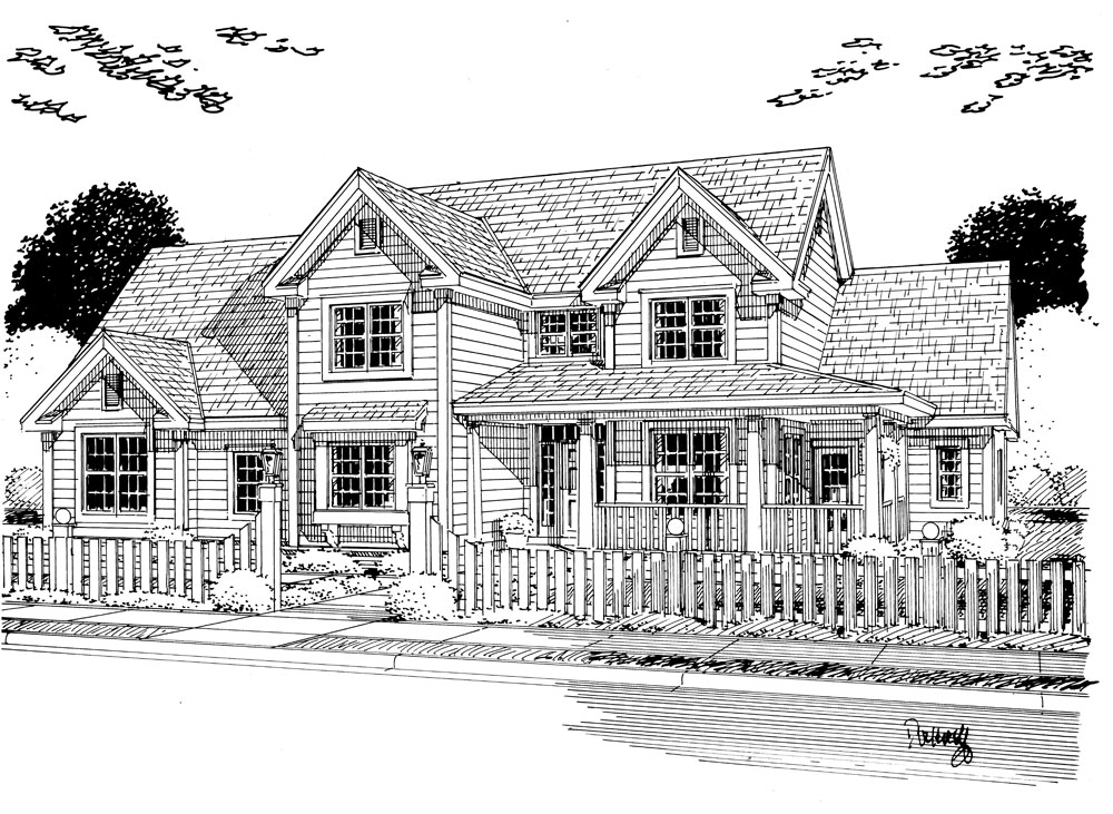This charming country style home floor plan invites you in with its charming exterior. Enter from the front porch and step into the lovely arched foyer. The foyer has storage and access to the study and dining room. Continue into the home and into the spacious open living room with built in fireplace. The living room openly flows into the kitchen and breakfast nook and gives you access to the large screened porch. The kitchen is galley style with a built in peninsula and eating bar that overhangs into the breakfast nook. The kitchen leads to the main floor laundry and a bedroom with a...