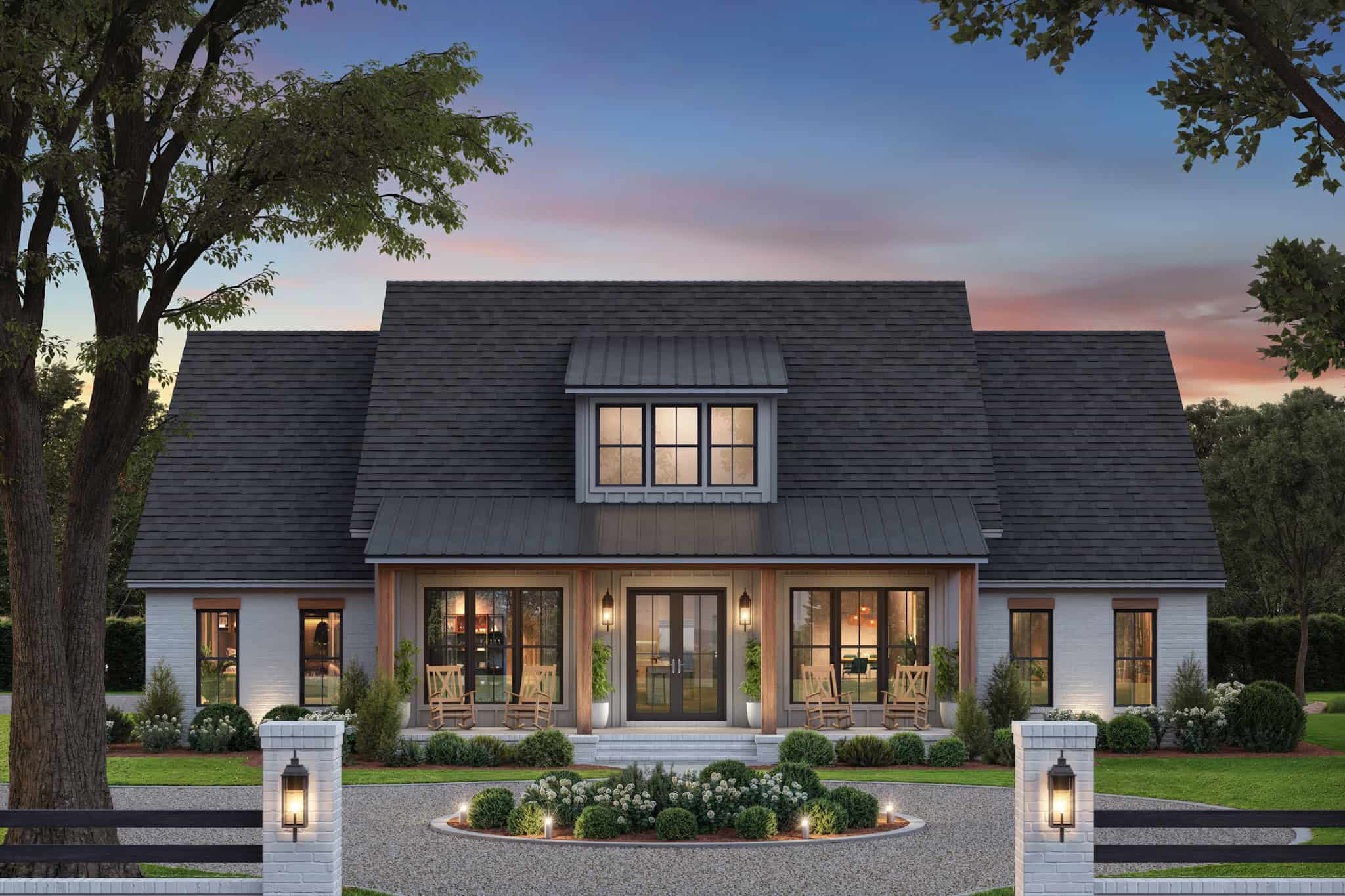 Sophisticated 4-bedroom, 2,585 sq ft modern farmhouse features an open kitchen and great room with decorative beams. Includes a private guest suite, oversized main suite, walk-in pantry, front and rear porches, future bonus space, and a large workshop.