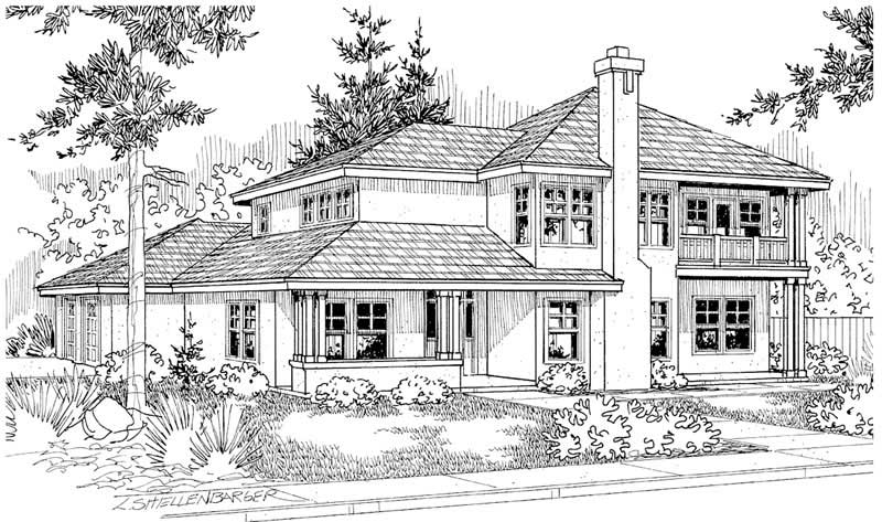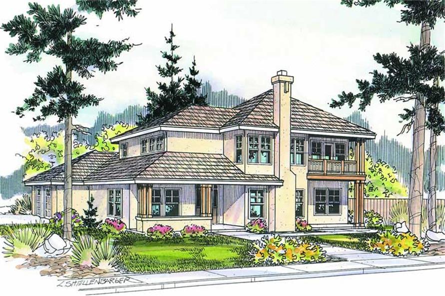 The #108-1287 house plan is a two story Mediterranean style house plan with 2602 total living square feet. This Mediterranean home plan features windows that wrap around two sides of the two-story family room, which includes a gas stove & nook. The second floor master suite has a study, balcony, a roomy closet, and a luxurious bathroom. There are two more bedroom suites on the ground floor; one could be used as a home office.
