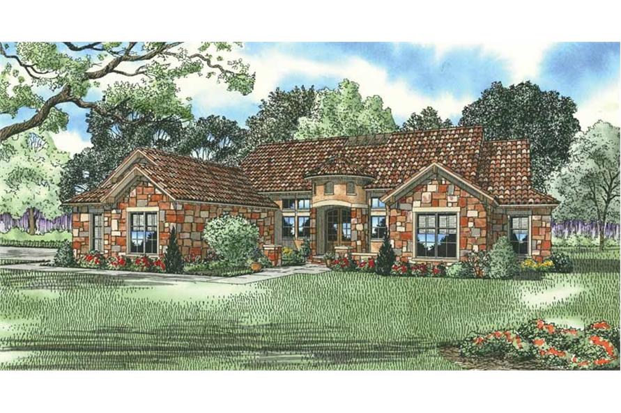 This dramatic Tuscan style home with country attributes (House Plan #153-1141) has 2609 square feet of living space. The 1.5-story floor plan includes 4 bedrooms and an interior atrium.