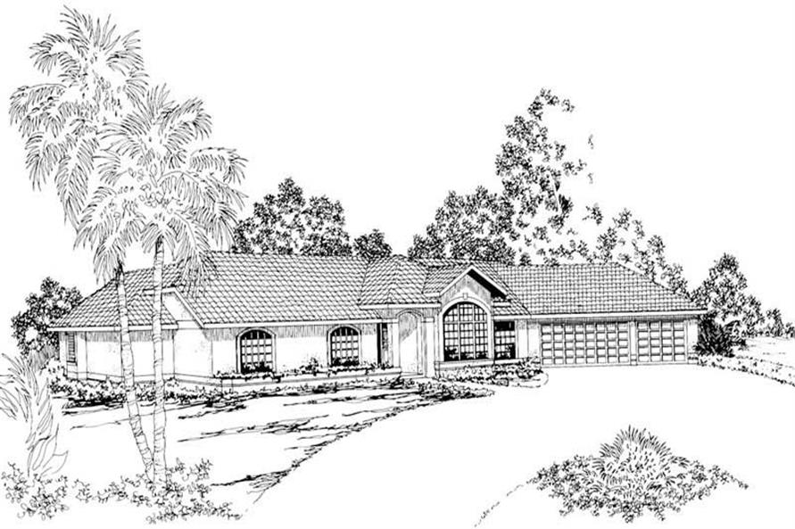 The #108-1356 home plan is a great single story ranch style house plan with 2623 total living square feet. This is a wide ranch home plan with three-car garage and is more equipped for construction on a large lot. There are tropical influences in the stucco, tile roof, & arched windows; these give this home a true Mediterranean feel.