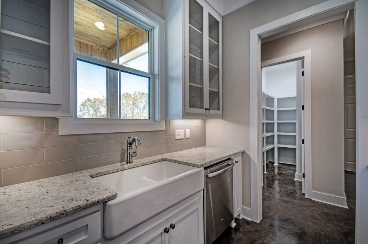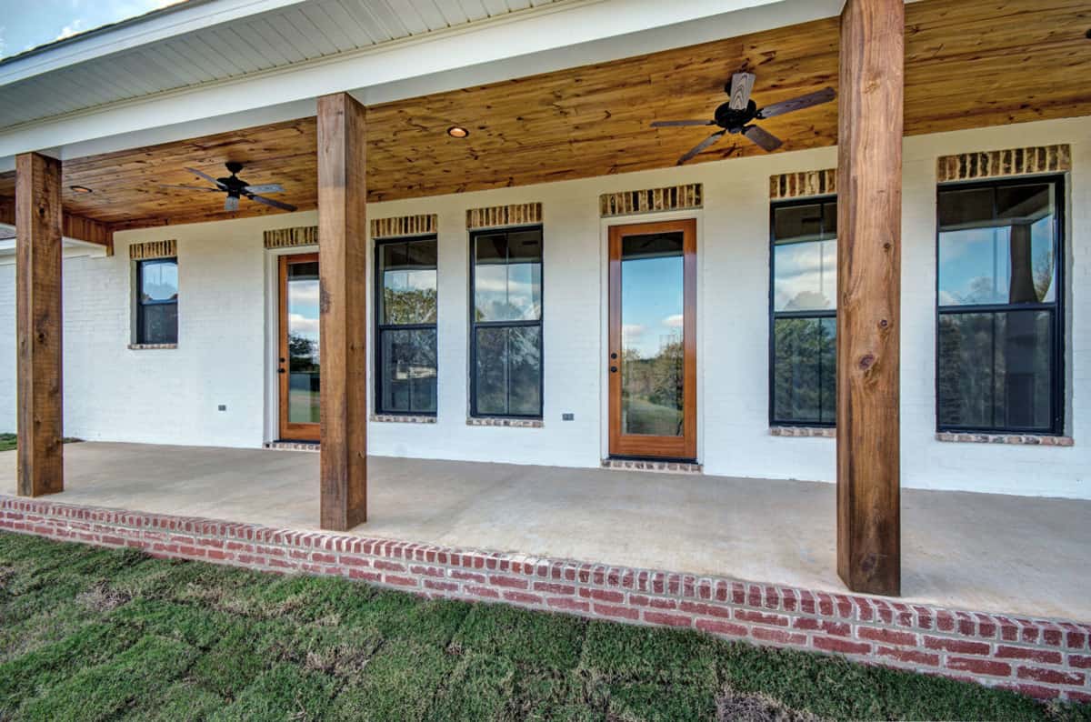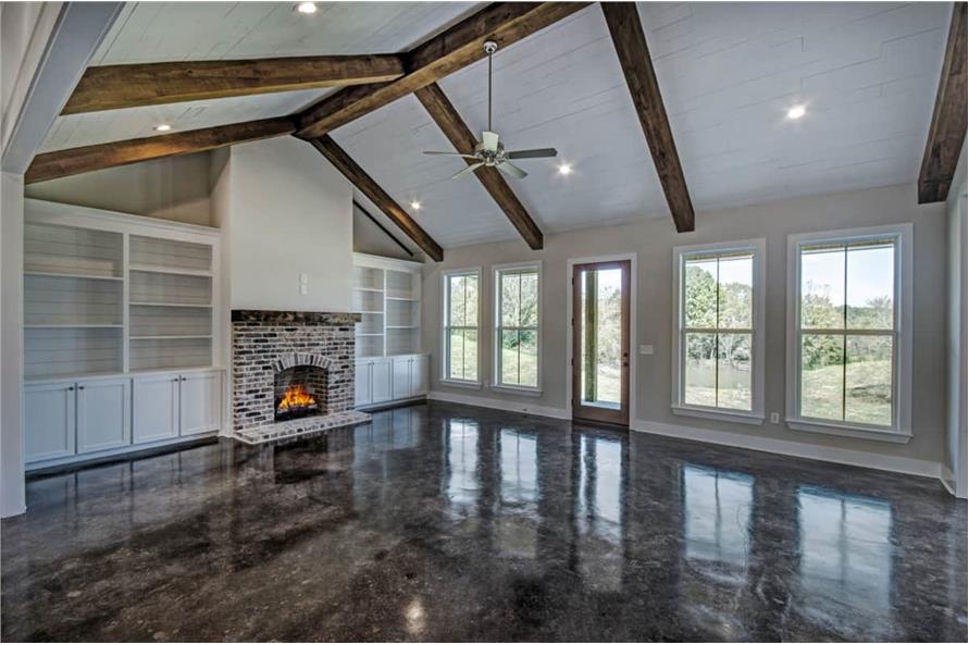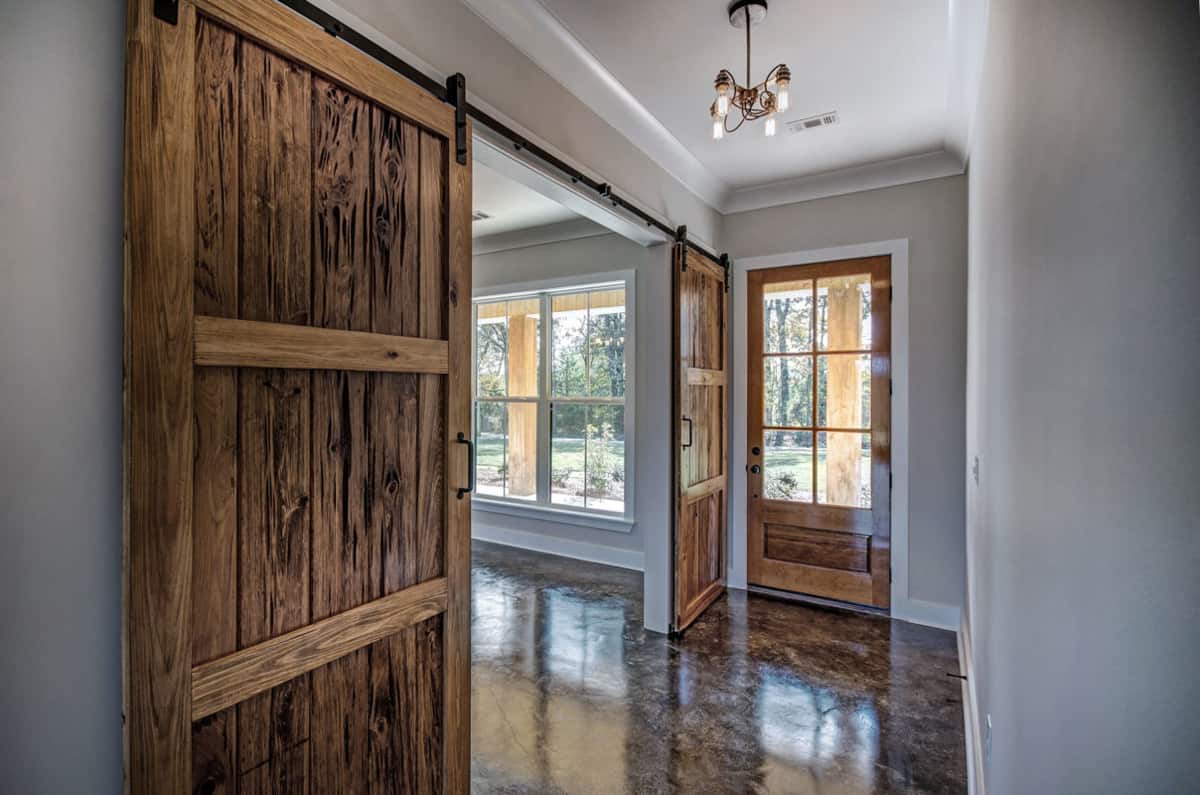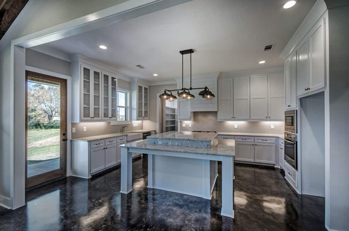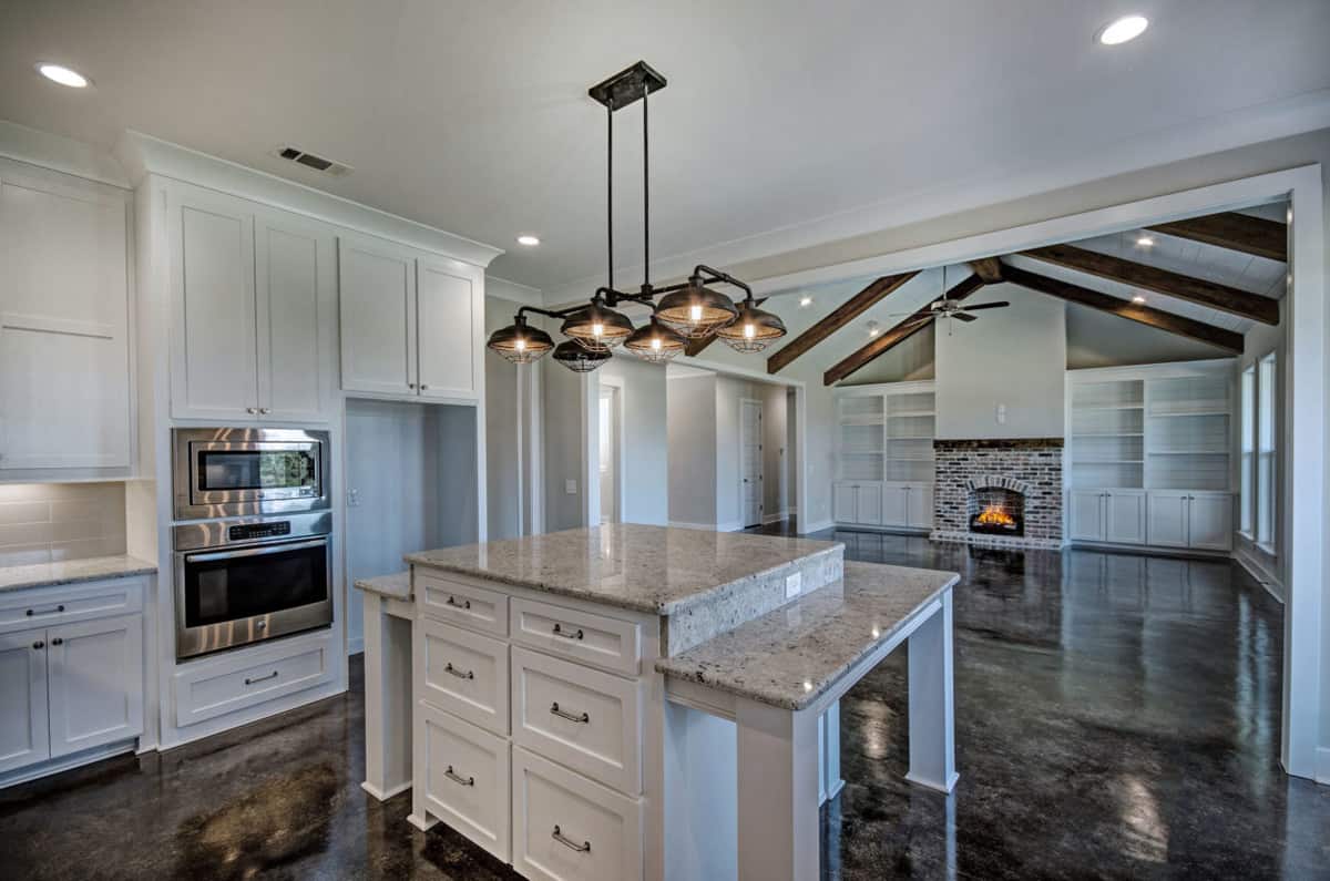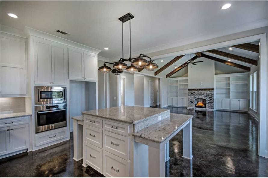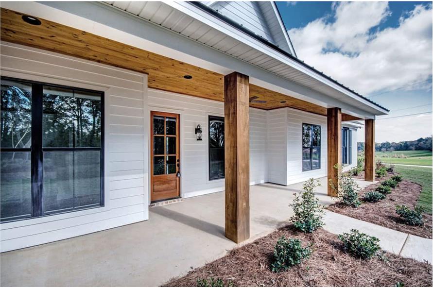 This Ranch-Country style home with Farmhouse characteristics has a warm, inviting ambiance that lives up to its pedigree. The varied asphalt-shingle-covered rooflines, front-facing center gable, and natural timber porch columns give the home an interesting character. The house has a heated-cooled area of 2677 square feet with 686-square-foot side-loading 2-car garage, whcih provides private access at the back of the kitchen area – very convenient for unloading newly bought grocery items.