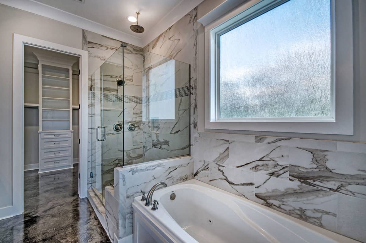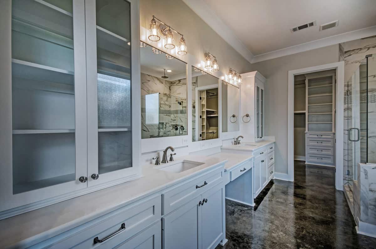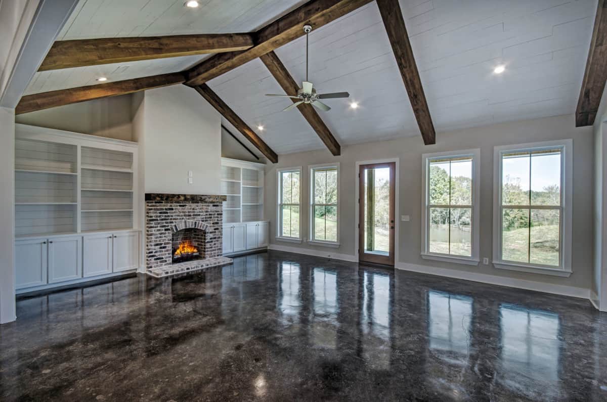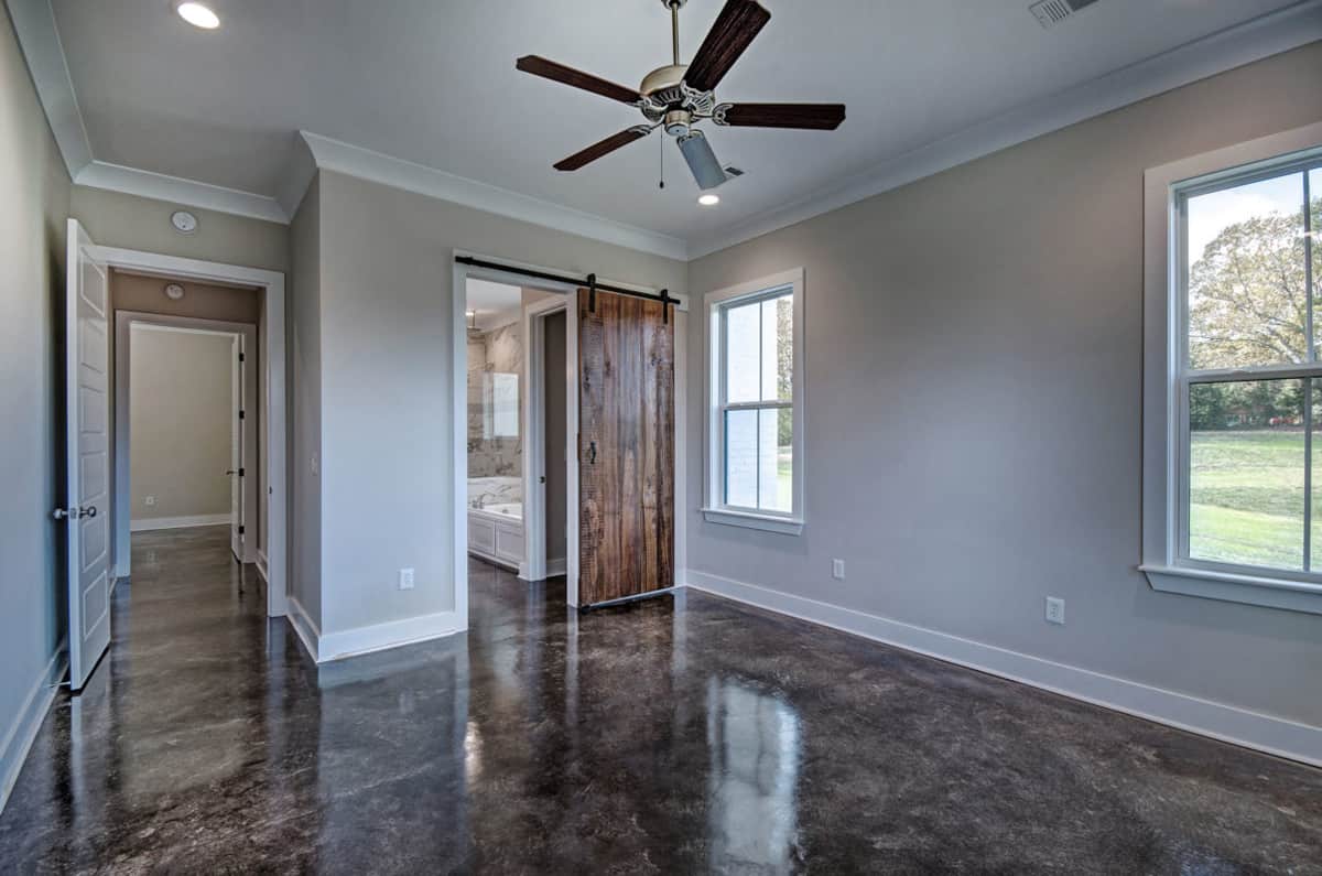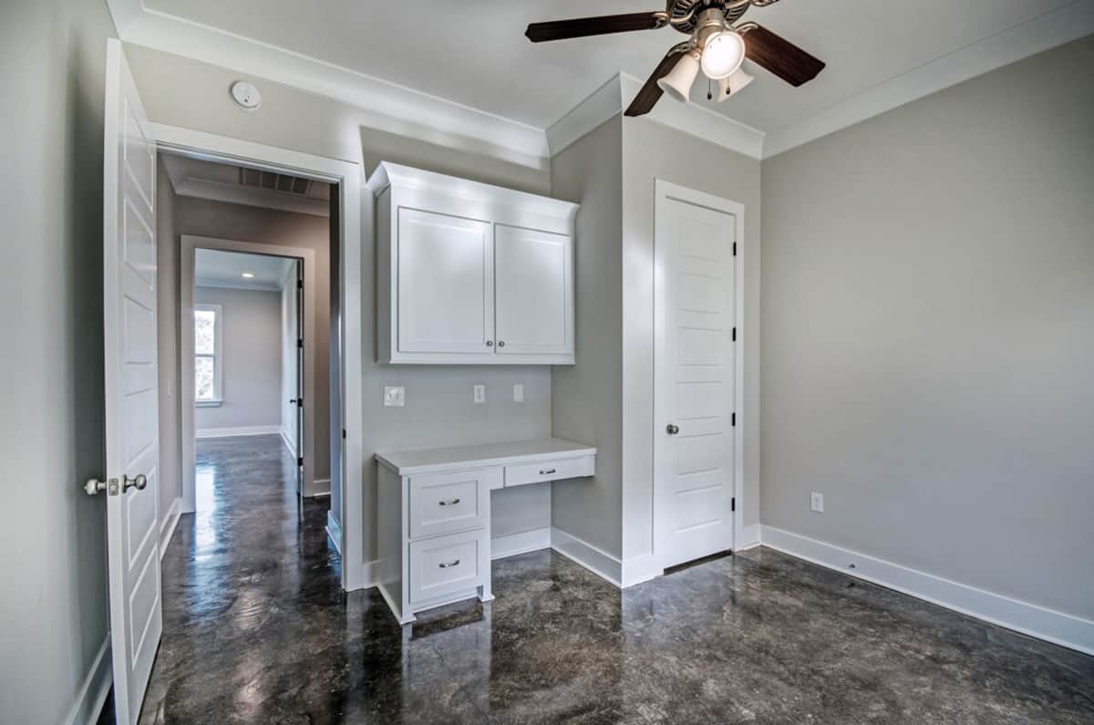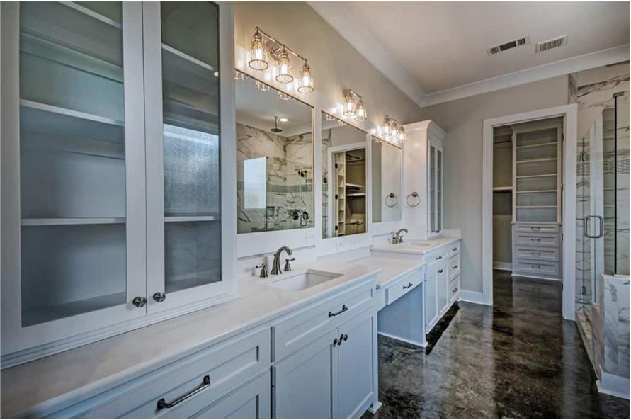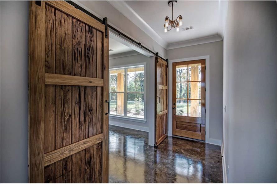 This Ranch-Country style home with Farmhouse characteristics has a warm, inviting ambiance that lives up to its pedigree. The varied asphalt-shingle-covered rooflines, front-facing center gable, and natural timber porch columns give the home an interesting character. The house has a heated-cooled area of 2677 square feet with 686-square-foot side-loading 2-car garage, whcih provides private access at the back of the kitchen area – very convenient for unloading newly bought grocery items.