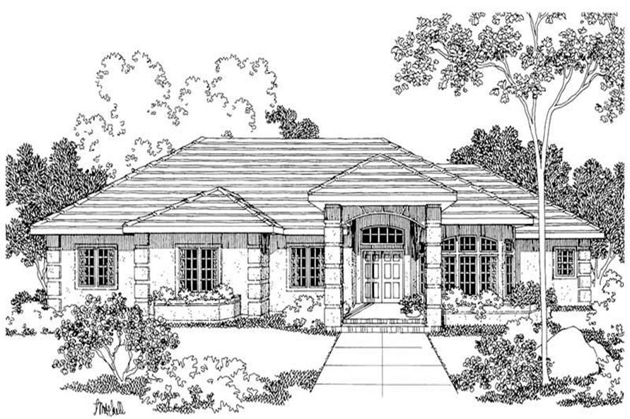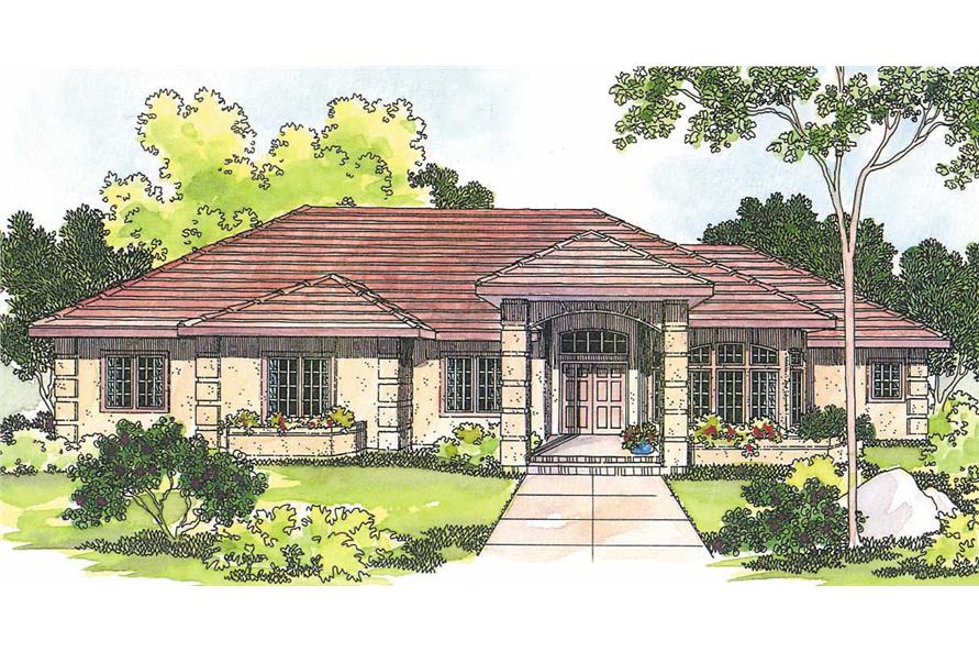 The #108-1222 home plan is a single story, southwestern style house plan with 2692 total living square feet. This southwestern home plan features a noteworthy porch, planters, arched windows, and a raised stucco quoins. The large home office is next to the luxury master suite with a bright sitting area. The utility with a sink is close to both the kitchen and secondary bedrooms.