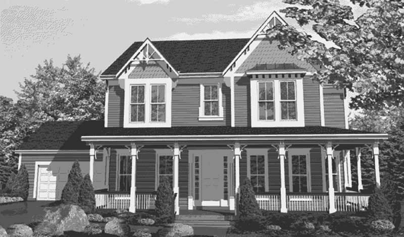 Eave and porch details give this farmhouse design a storybook touch. A nostalgic, wraparound porch fronts the home, begging for a rocking chair and lazy summer days. Inside, the formal dining room and the vaulted living room flank the two-story foyer. Double doors in the living room lead to a cozy den. The spacious family room opens to the kitchen and the breakfast nook, which boasts access to a back deck. The master suite's location affords a measure of privacy, yet allows parents to be near young children.