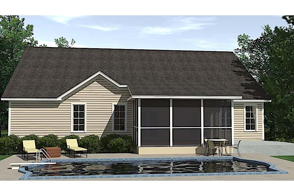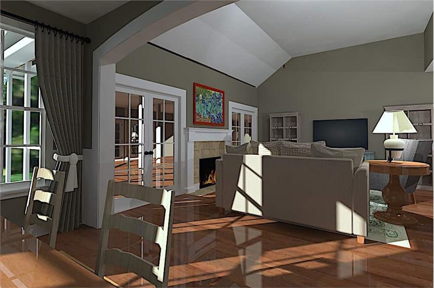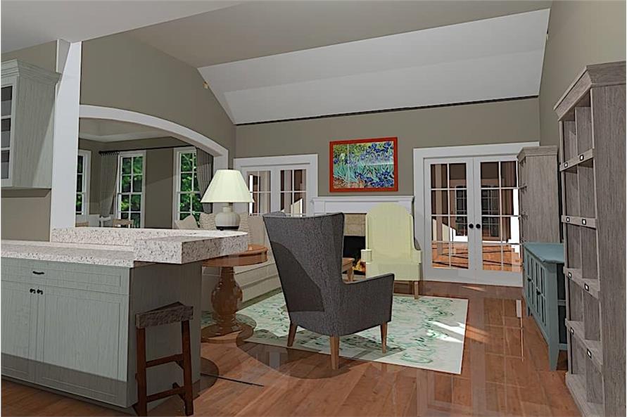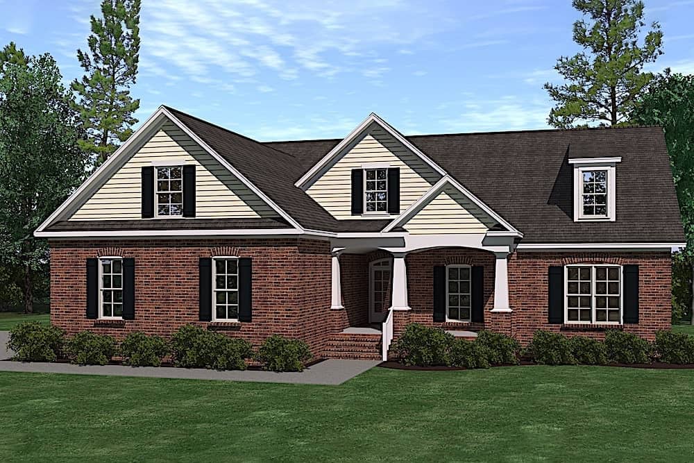 This Traditional style country home is a great plan for a corner lot, with its side-load garage. The open concept floor plan covers a total finished and unfinished area of 3,776 square feet under its roof with a 655-square-foot garage, 387 square feet of porch area, and 2734 square feet of finished living space. The 2-car garage is located at the front with its door opening at the left side.
