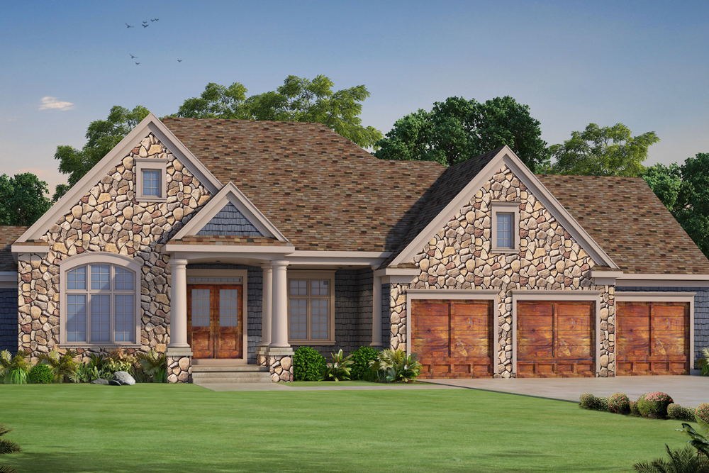 This rustic Ranch style home with loft and optional finished basement is sure to be at the top of your list of desirable plans. The home covers a heated area of 2815 square feet with a 623-square-foot unfinished and 2,192 optionally finished basement level. It has a good combination of natural stone and earth-toned hues that exude a warm, homey ambiance both inside and out.