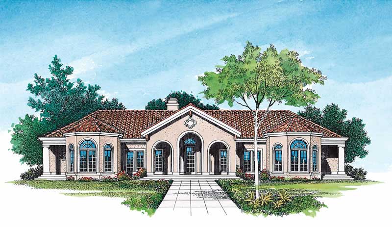 Large Mediterranean home plan entering the foyer from the large covered porc there is a fountain and the dining/living are off to the sides. The home has a open floor. And the master suite is beautifully done.