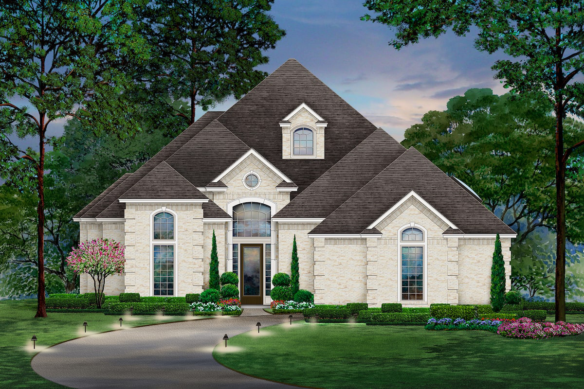 This lovely Tudor style home with European influences (House Plan #195-1208) has 2867 square feet of living space. The 1 story floor plan includes 2 bedrooms.