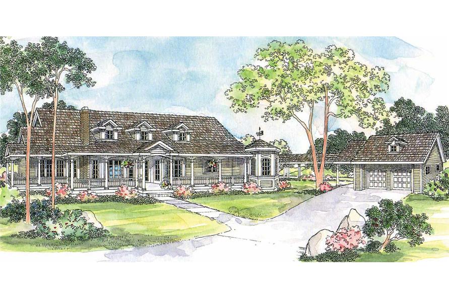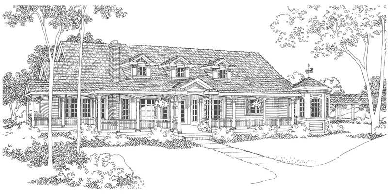 The #108-1458 home plan is a single story, country style house plan with 2966 total living square feet. This country home plan features a wide, cool, front veranda which is accessed from the master suite, foyer, and nook. The vaulted great room at the core has a corner fireplace and sliders to the patio. The spacious kitchen has a large work island and is linked to a gazebo-like nook.