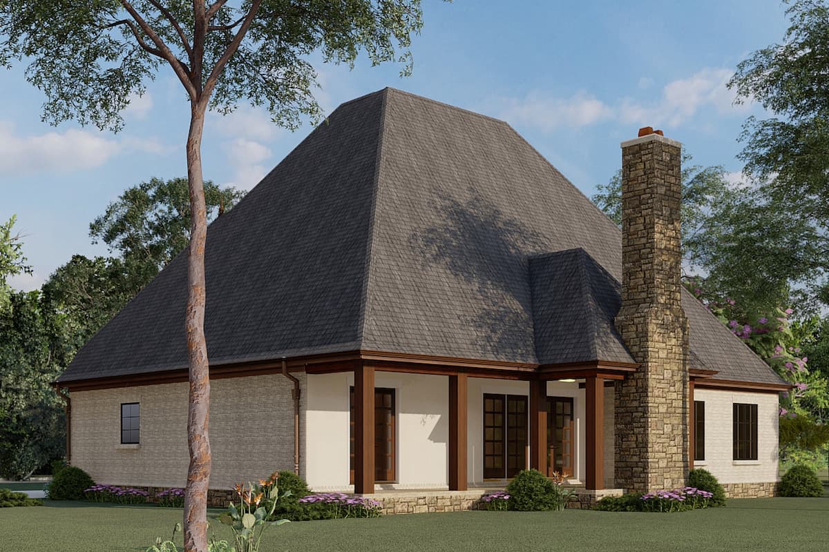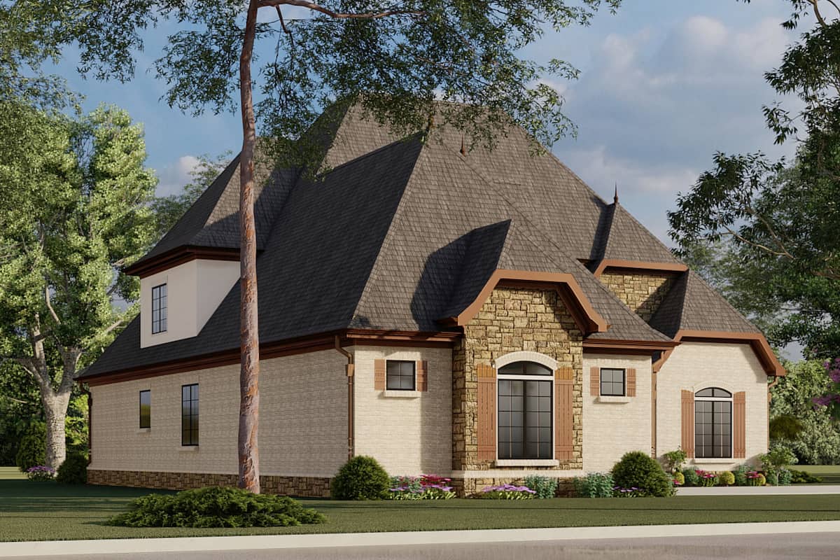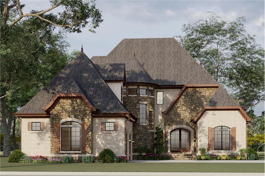 This striking European style home with Country Cottage characteristics (Plan #193-1007) has 2979 square feet of living space. The endearing 1.5-story home's floor plan includes 4 bedrooms.