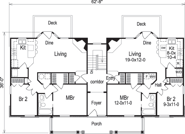 This lovely Multi-Unit style home (fourplex) with Country influences (Multi-Family House Plan #138-1124) has a total of 2986 square feet of living space. 2 Units on main level have 2 bedrooms and 1 bath each, while the other 2 units on the lower level have 1 bedroom each and 1 bath each.
