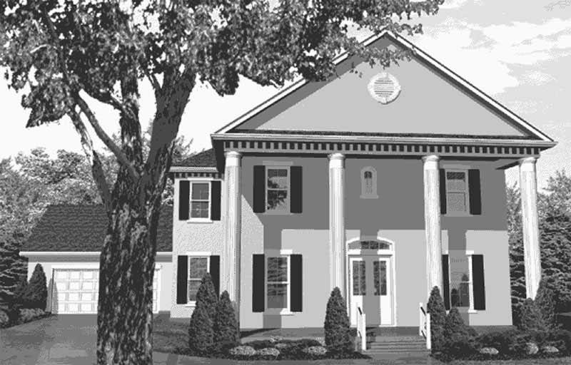 Tall, Colonial-style columns introduce this gracious two-story home, a design reminiscent of yesteryear. Just off the foyer, the versatile den with adjoins a full bath so the space can double as a guest- or in-law suite. A wall of windows lines the back of the home, where the kitchen/breakfast room and family room are open to each other to create a comfortable space. Four bedrooms are on the upper floor; double doors lead into the master bedroom, with its own bath and a hug walk-in closet.