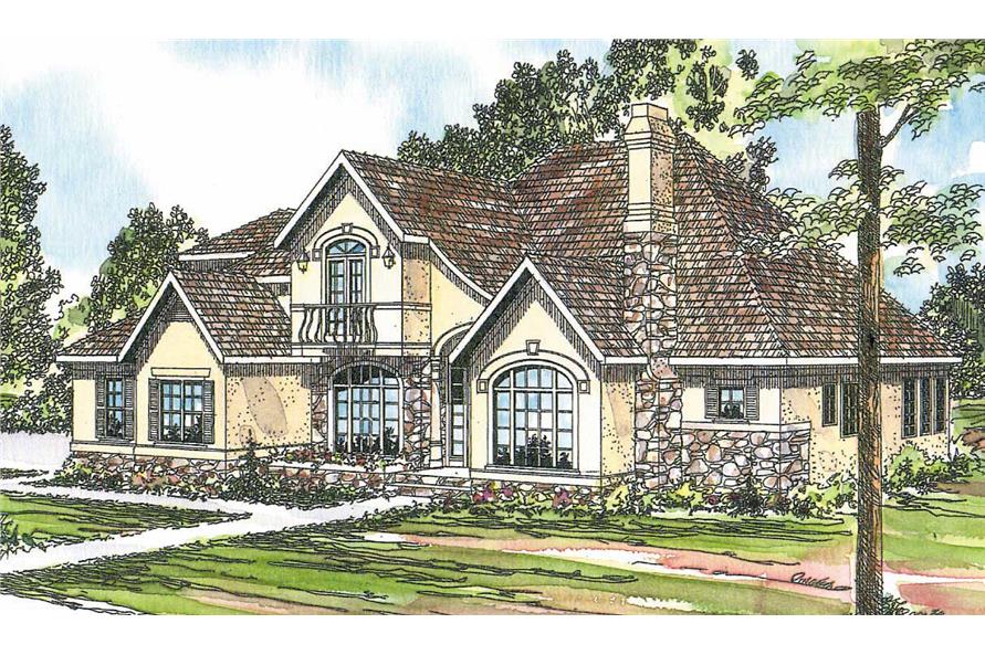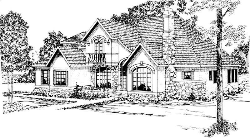 The #108-1174 home plan is a two story, European style house plan with 3129 total living square feet. The intriguing front facade of this European home plan mixes stone, stucco, wrought iron, arched openings, and keystones. The morning room, nook and utility room surround its large, modern kitchen, which links with the vaulted family room. Its owners' suite boasts a sunny sitting room, luxury bathroom, and two walk-in closets.