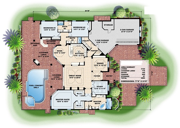 This elegant Spanish style home with Mediterranean characteristics (House Plan #133-1060) has 3122 square feet of living space. The 1-story floor plan includes 3 bedrooms. Note: swimming pool is concept only.