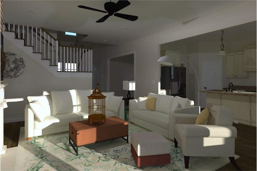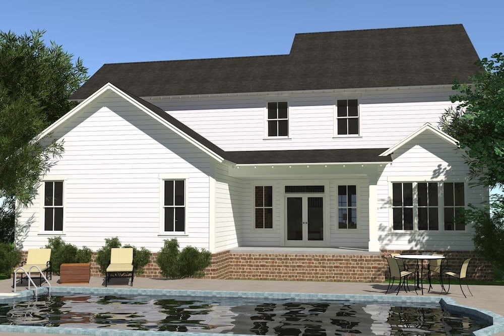 This Traditional style home is a 4 bedroom front-load-garage plan with a farmhouse look to the exterior and an open floor plan. The house has a total finished and unfinished area of 4,145 square feet with 3,287 square feet of living space, a 533-square-foot 2-car garage, and 325 square feet of porch space at the front and rear.