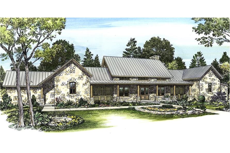 This impressive Texas Hill Country ranch home, with its stone exterior, metal roof, and raised central roof, boasts architectural creativity and craftsmanship rarely seen today. The wide front porch with its wood and stone columns leads inside to an entry hall. The home flows into the vaulted living area with a fireplace and views to the rear porch. Steps away are the breakfast area and kitchen with an island. Completing the living area are an impressive formal dining room and an office/study. Designed in a split layout, the sleeping quarters provide space and privacy for the primary suite...