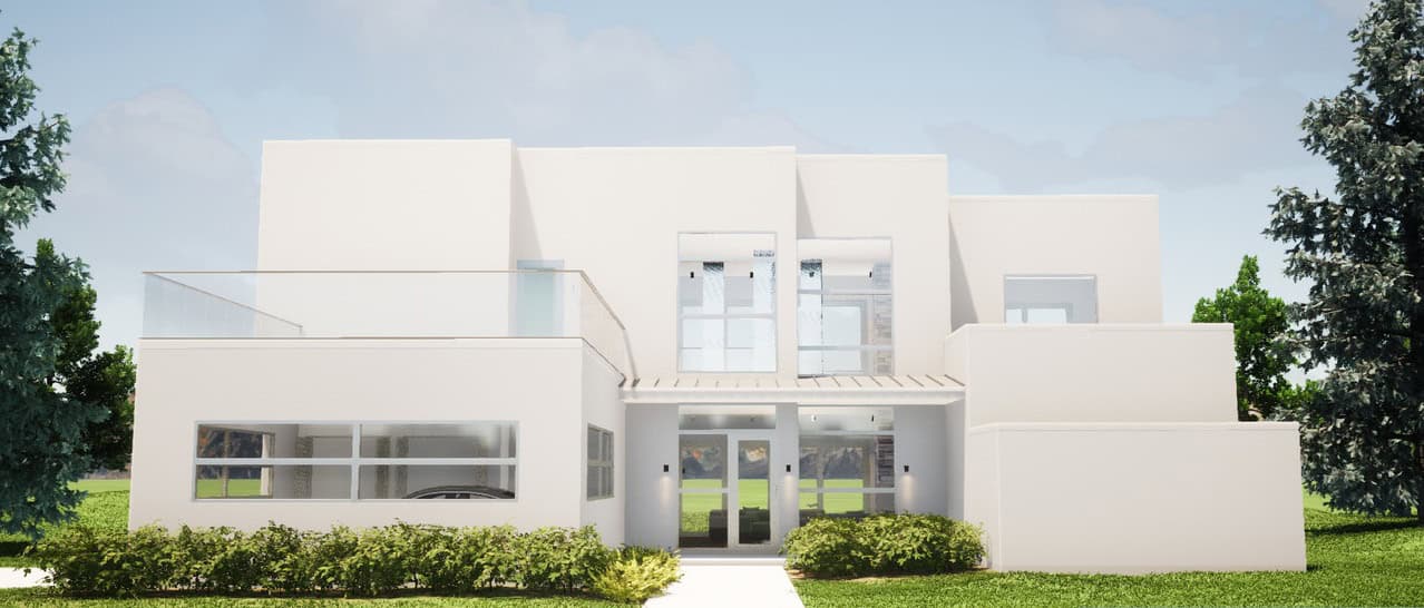 This 2-story modern home offers a clean, functional layout of 3,375 sq ft of living space. The open floor plan features a spacious Living Room with double-height ceilings and a central fireplace. The open-concept kitchen includes a large island and flows directly into the dining area, creating a connected space for daily living and entertaining.