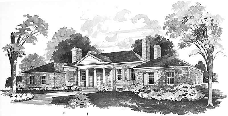 Elegant single floor NeoClassical home plan style. This home has it all, bedroom/sewing, clutter room, country kitchen, library, dining, living, and to top it off great master quarters.