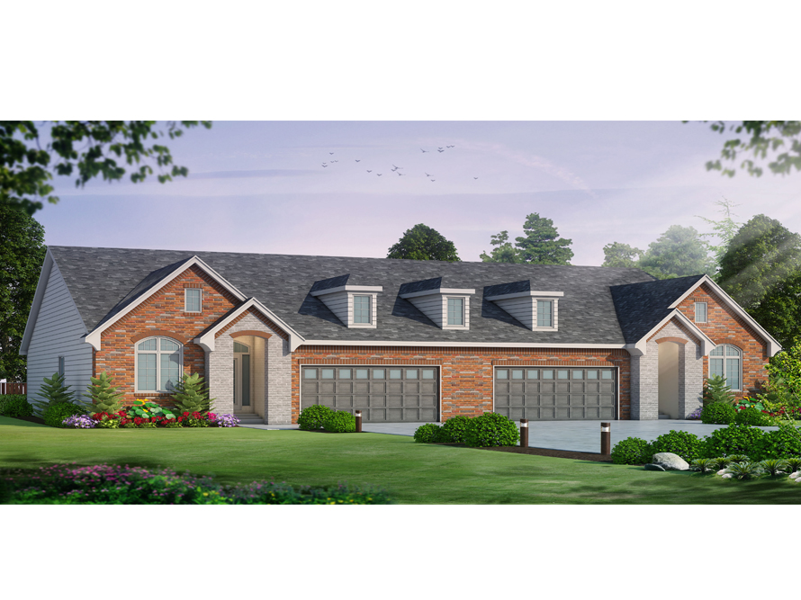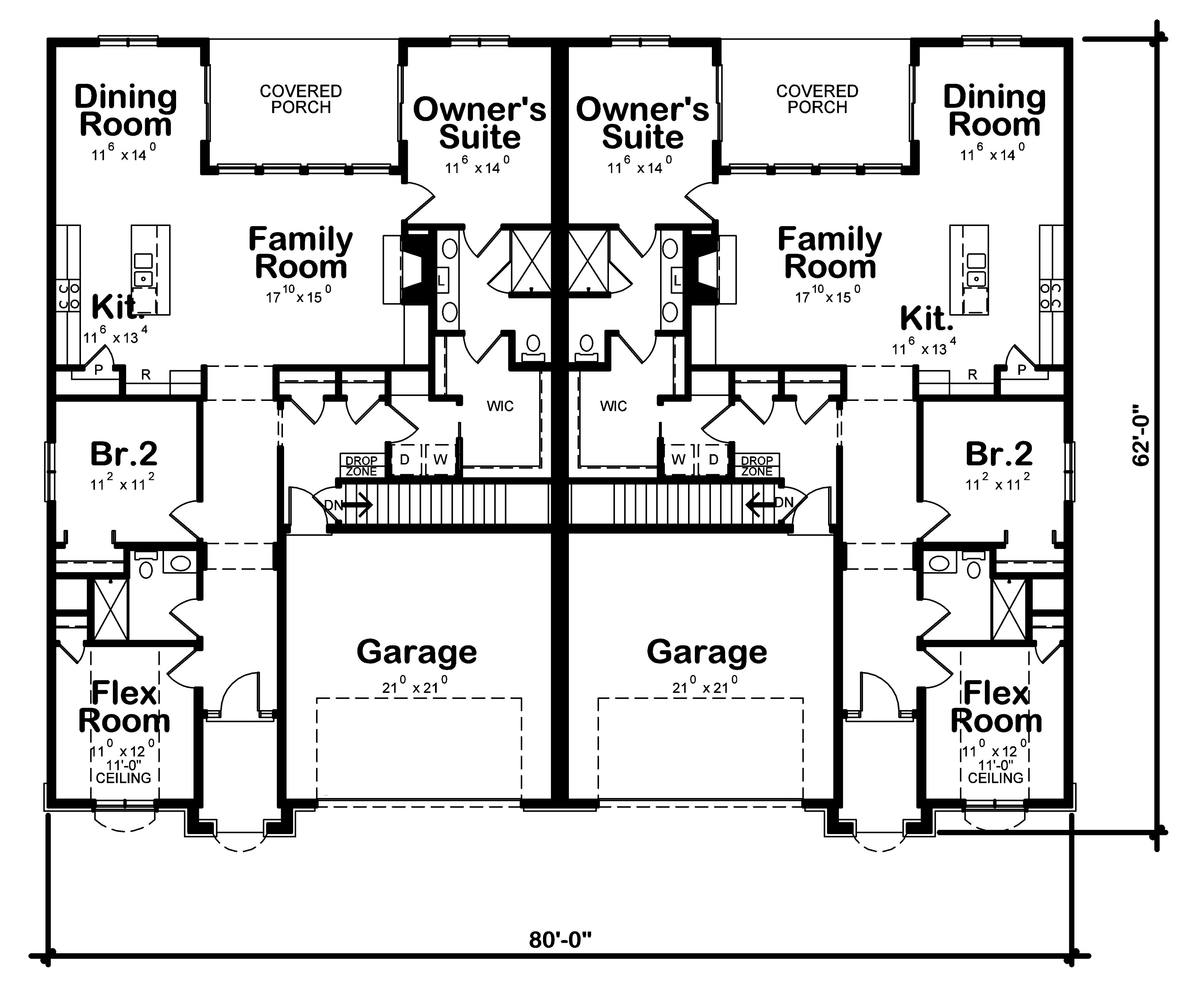 This duplex plan with French influences has 1742 square feet of living space per unit. The 1-story floor plan includes 2 bedrooms plus a flex room per unit. There is an option to convert the second bedroom and the flex room into a second master suite.