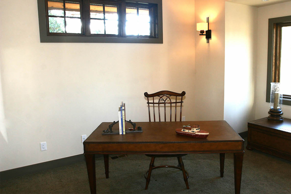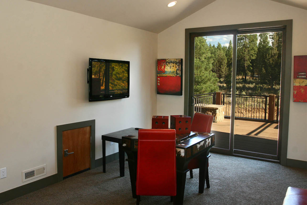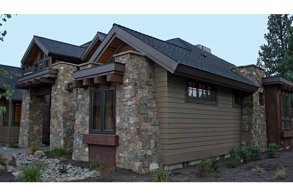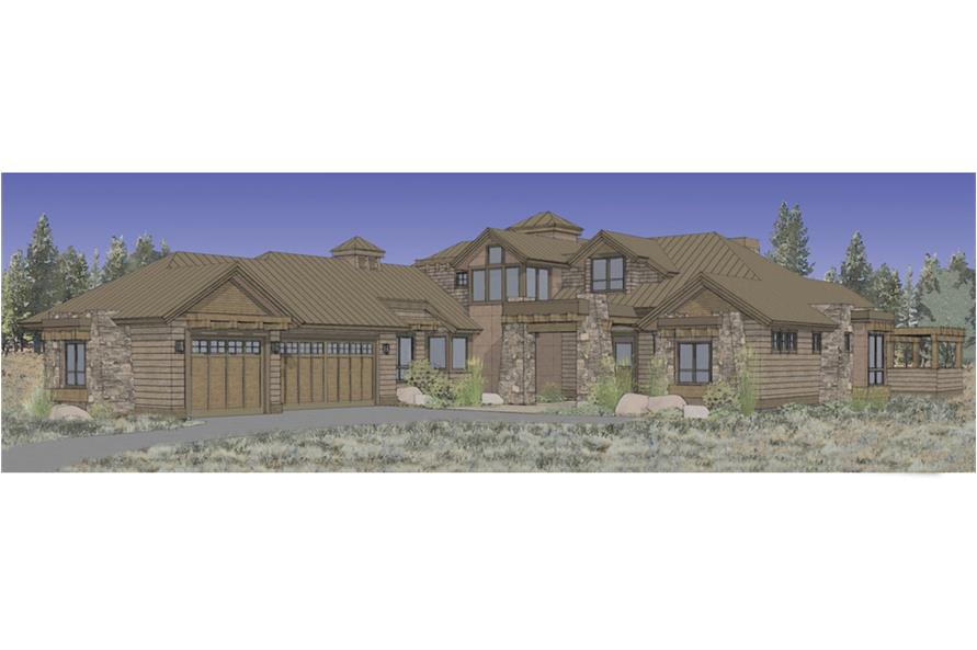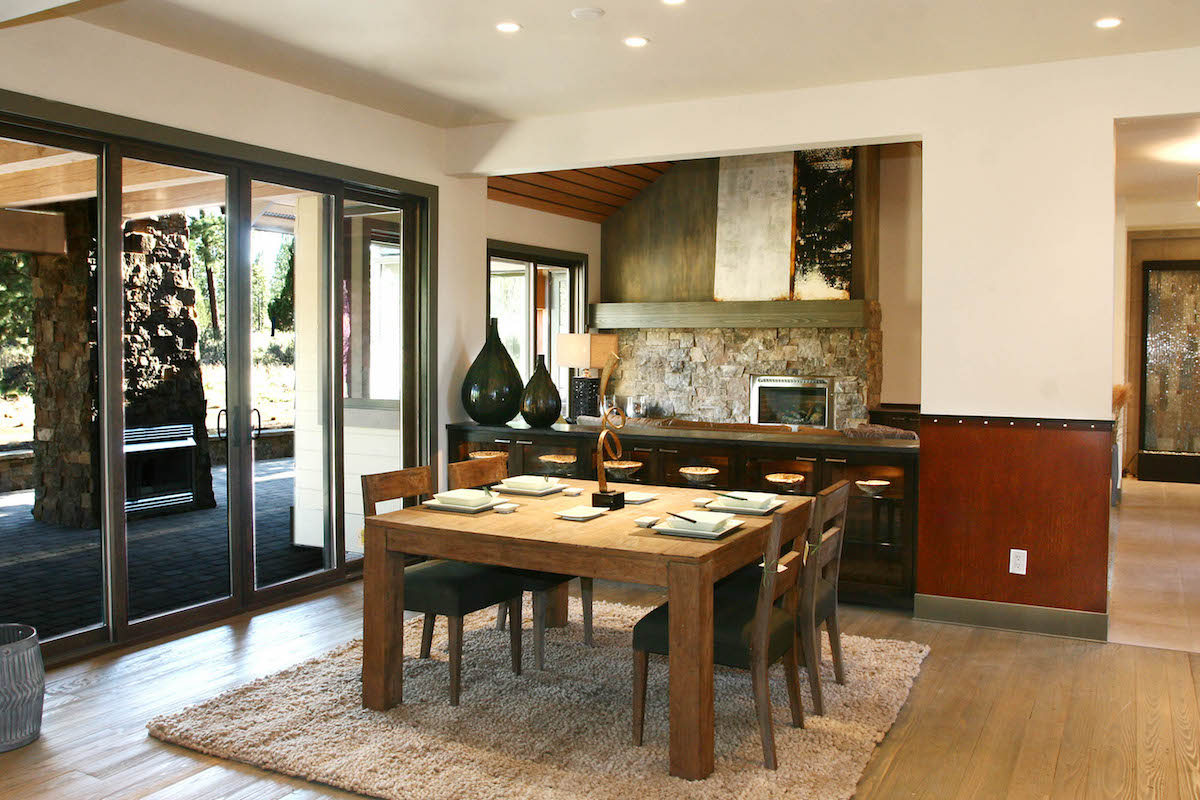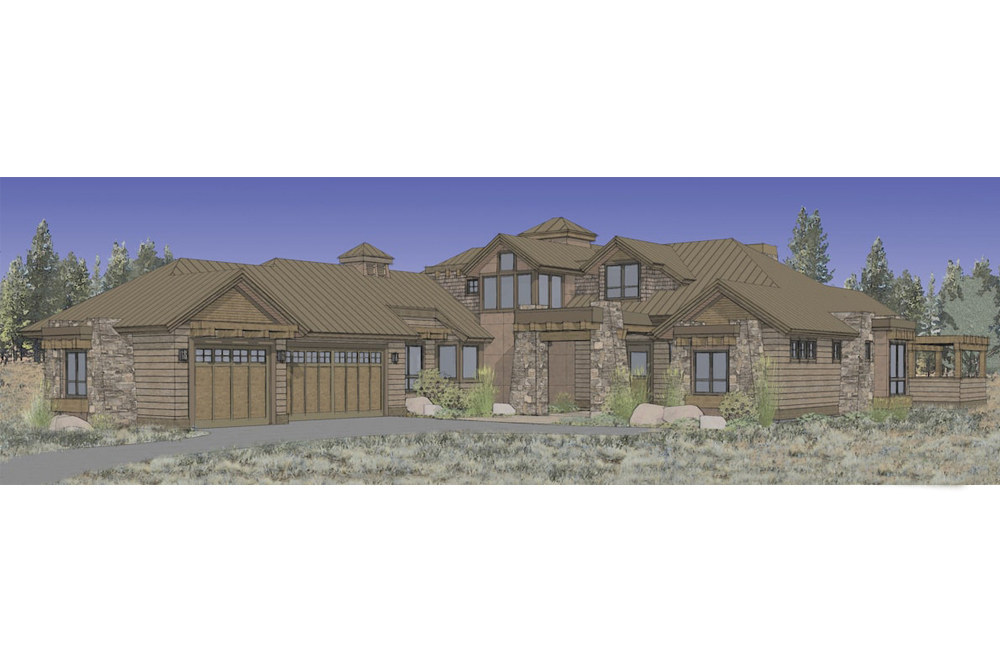 This luxurious contemporary rustic lodge has 3,513 square feet of living space. This residence follows a 1.5-story floor plan and offers four bedrooms, including two main-floor primary bedroom suites.
