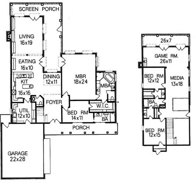 This Spanish style home has a great floor plan. Four bedrooms, 3.5 baths, two-car garage with large utility. Front porch with arched columns leads in to large foyer with stairway to upper level, access to two bedrooms, and entry way to kitchen, dining room, and eating area . Living room in back of house with fireplace and wrap-around screen porch. Upper level has two bedrooms, media room, and game room.