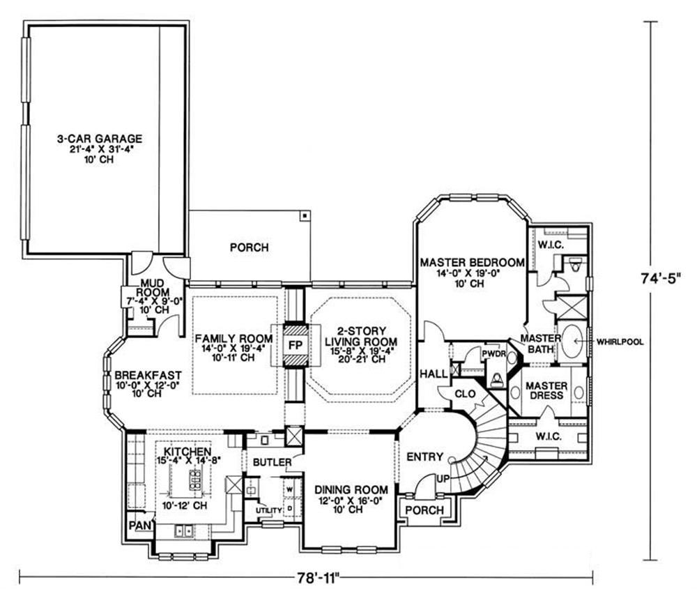 If you're looking for luxury and space, this two story European Style house plan is for you. The main level Master Bedroom is very roomy and has private entry to the Master Bath and two walk-in closets. You'll be sure to enjoy the great and spacious Dining Room, which is right next to the equally large Family Room and Living Room. The Living Room will be sure to give you a sense of openness with its 20-21 foot ceiling, yet will still keep home-like comfort due to its shared fireplace. The feeling of roominess also extends to the second story with 11 foot ceilings the three...