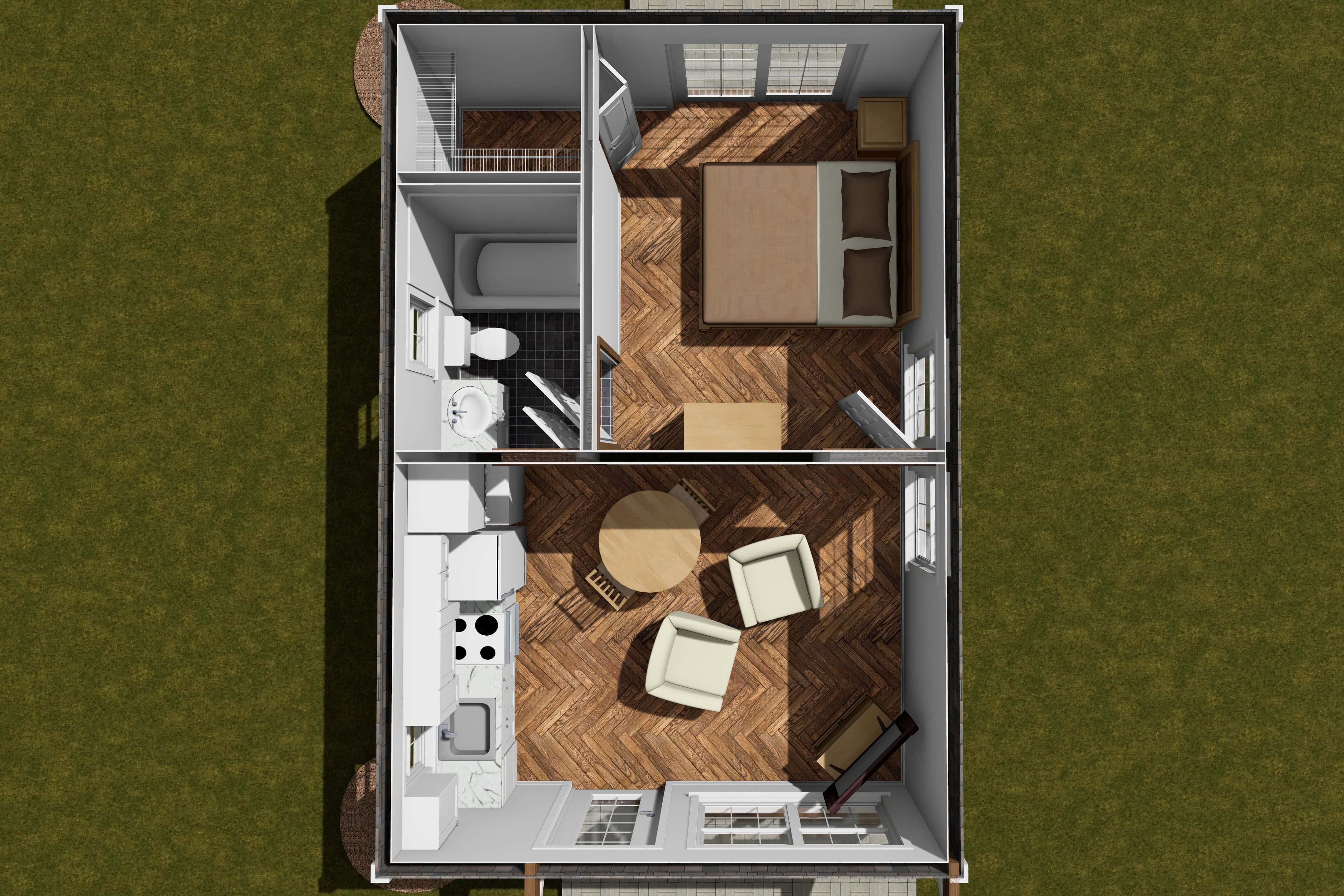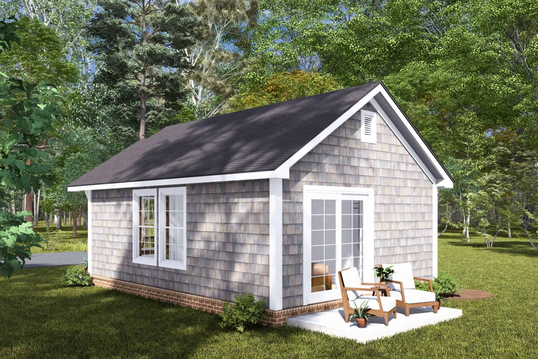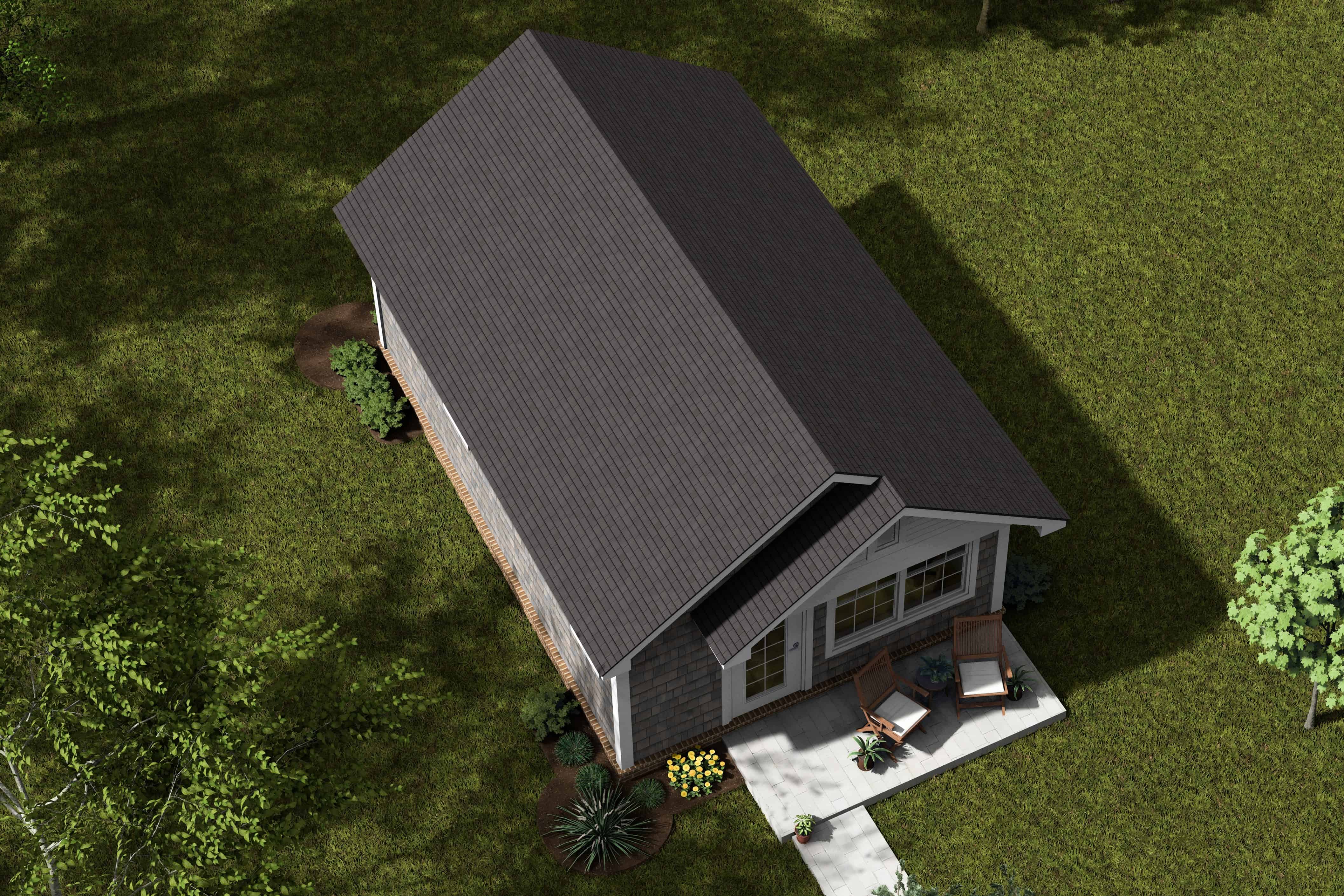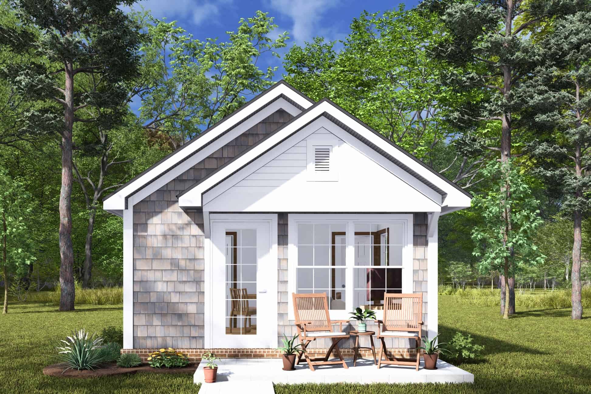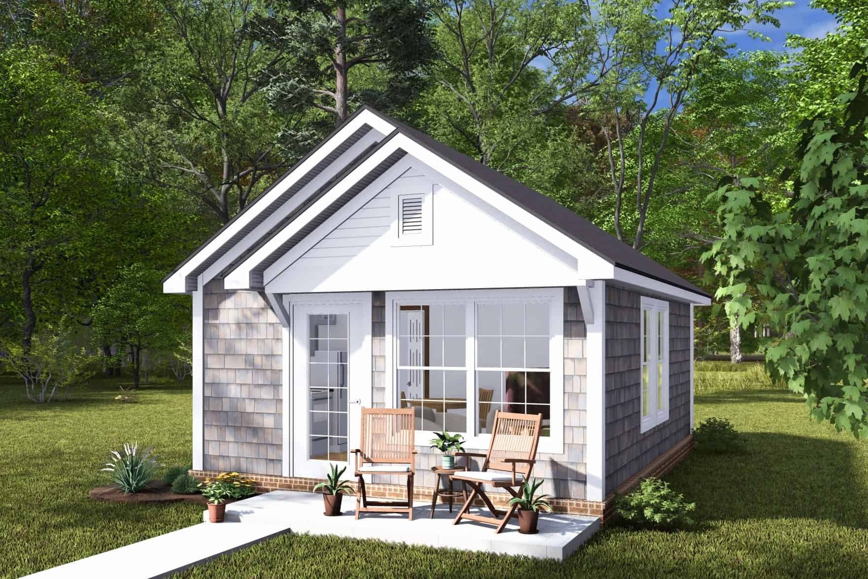 This tiny 1-bedroom, 384 sq. ft. cottage plan is perfect for a narrow lot. It features a vaulted living room, open floor plan, main level laundry, and a main floor master bedroom, offering cozy and efficient living in a compact space.