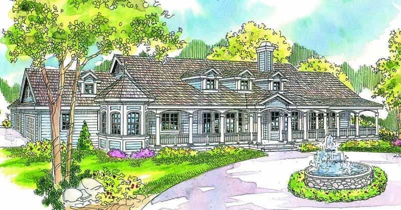 This is a two story, country style house plan with 3959 total living square feet. Classic arches and columns highlight a long veranda, in this country home plan. The #108-1673 features an octagonal dining room and lofty, vaulted great room with a gas fireplace. Included in the kitchen is a large central work island with a vegie sink and a six-burner cook top.