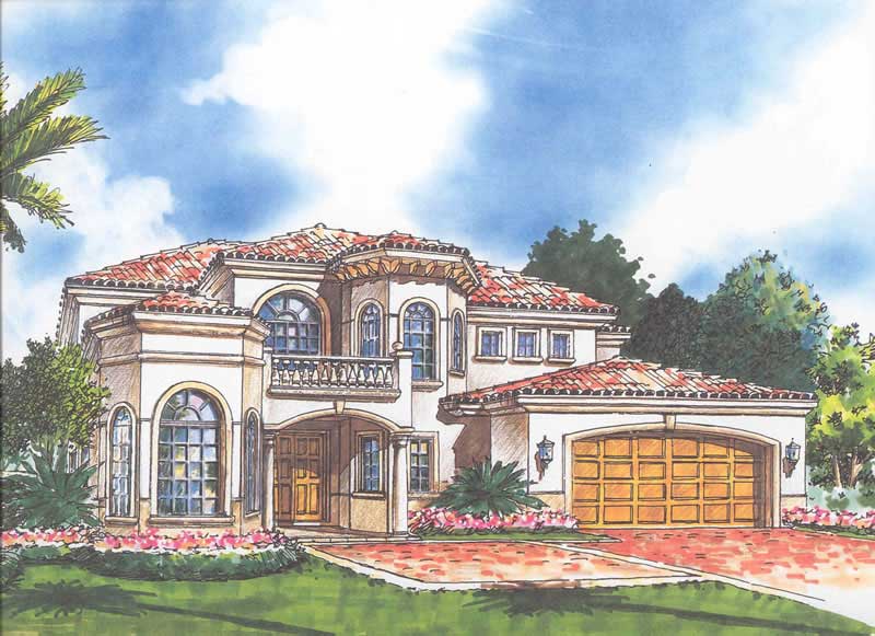 Home Plan #107-1217 is a two story Mediterranean style home plan with 3 bathrooms, 3 bedrooms, and a 2 car garage. This home plan also has a covered porch.