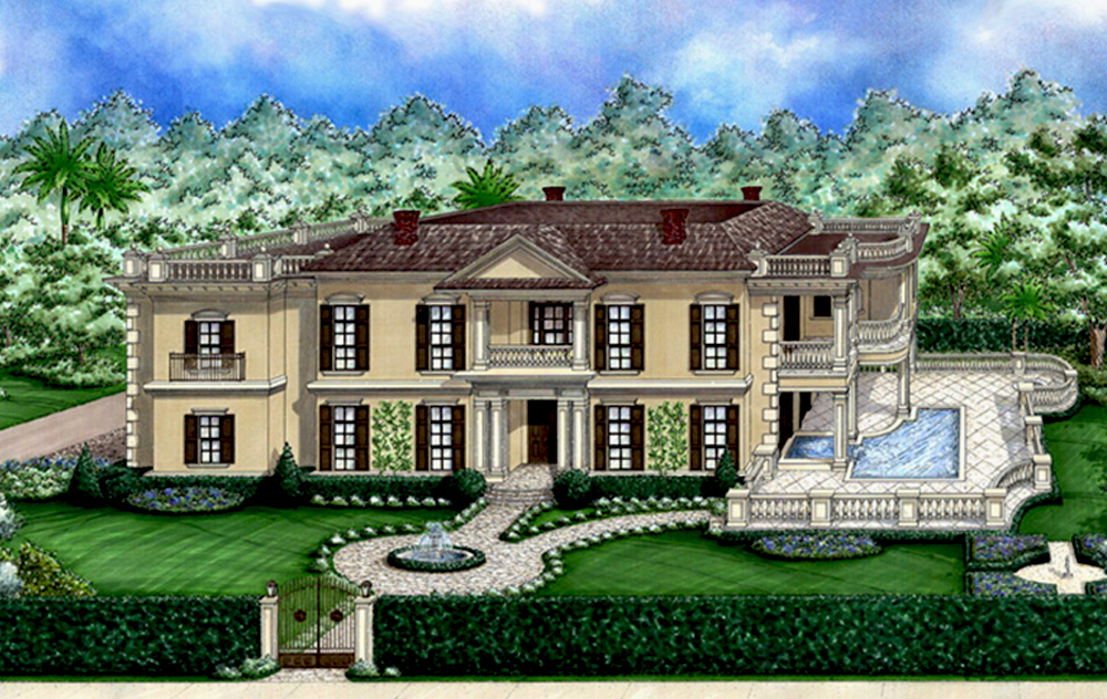 This lovely Coastal style home with Colonial influences (House Plan #175-1234) has 5585 square feet of living space. The 2 story floor plan includes 4 bedrooms.