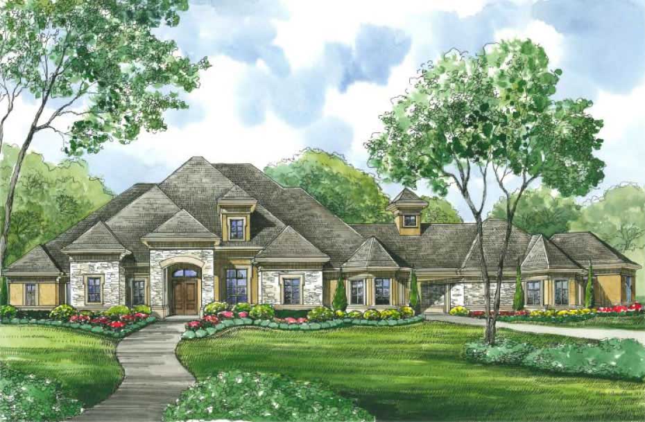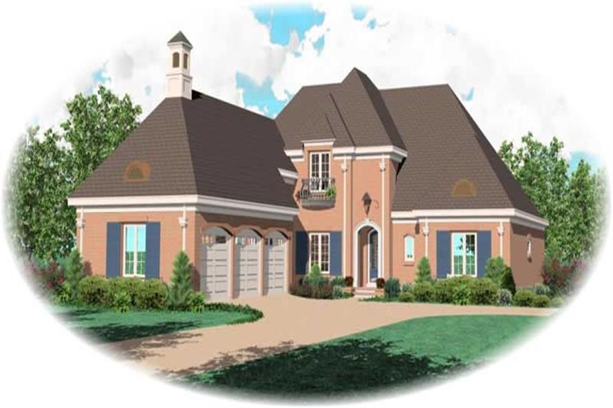 This alluring French style house design has 4,209 square feet of living space. The two-story floor plan includes 4 bedrooms and 3 bathrooms.