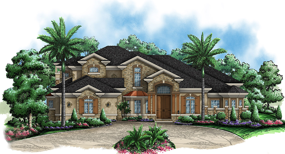 This lovely Contemporary style home with Mediterranean influences (House Plan #175-1169) has 4599 square feet of living space. The 2 story floor plan includes 4 bedrooms.