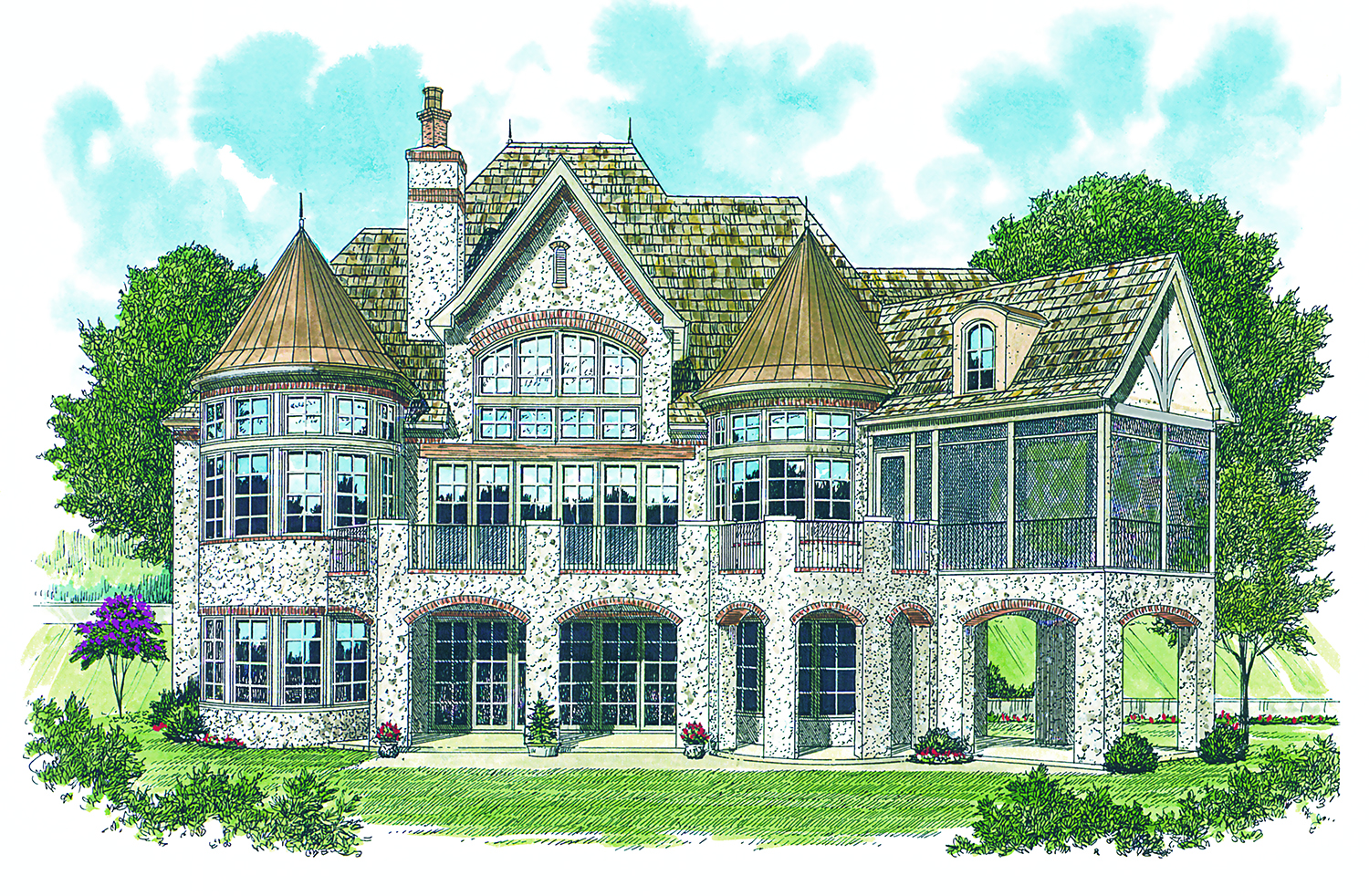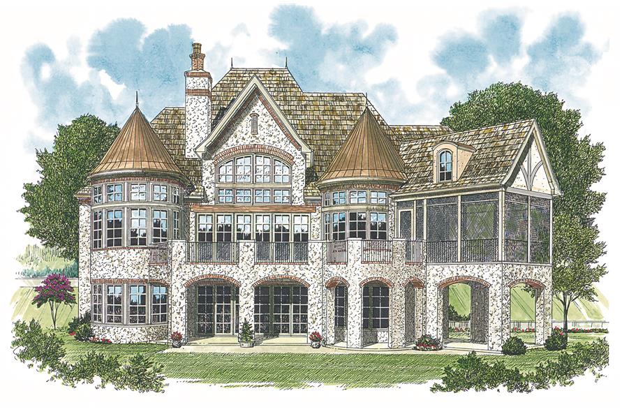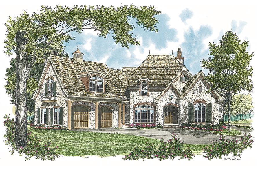 This lovely European style home with French influences (House Plan #180-1013) has 4731 square feet of living space. The 2 story floor plan includes 4 bedrooms.