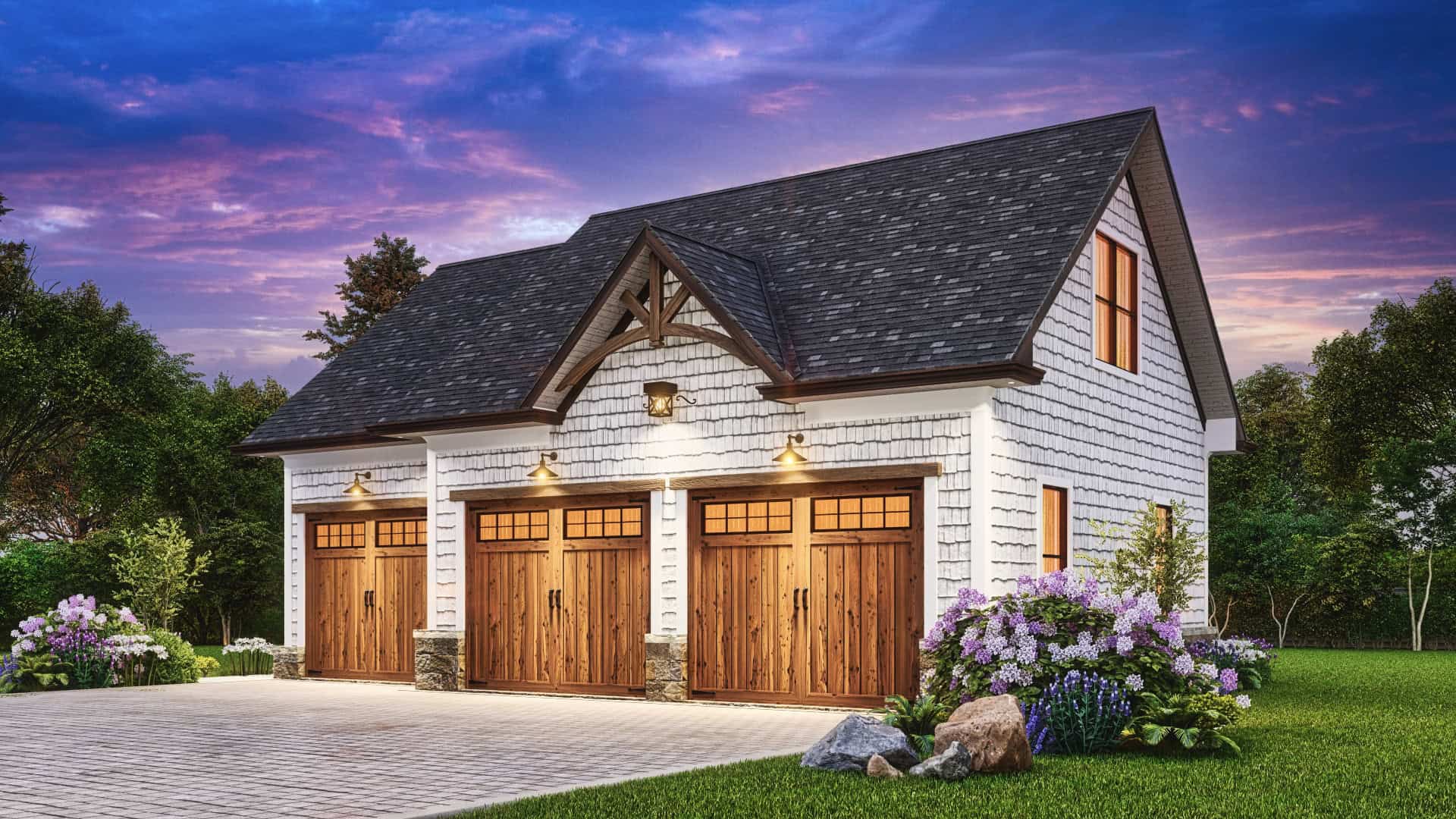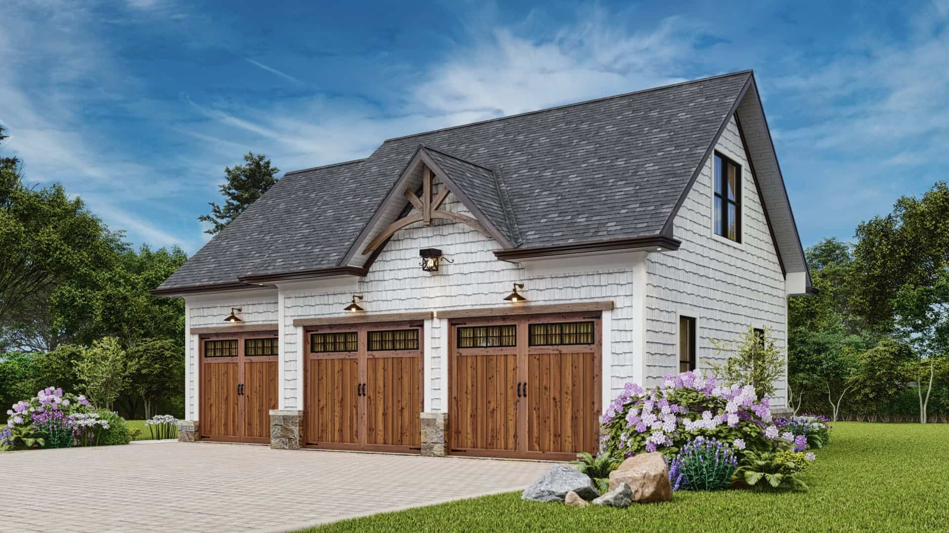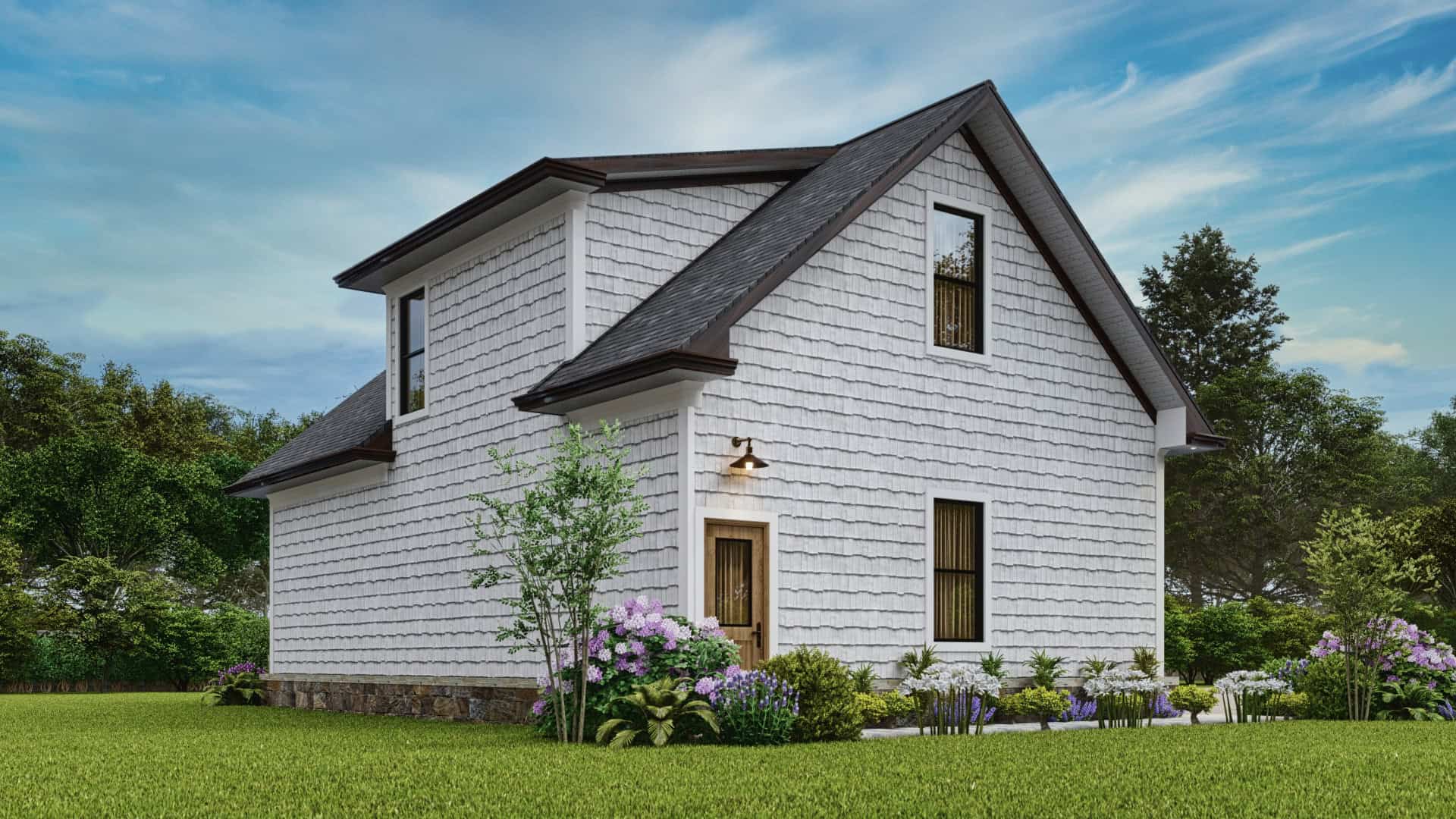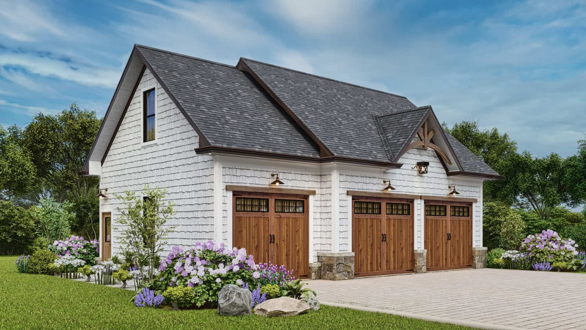 Designed with charming Cabin style details, this 964-square-foot garage plan accommodates two vehicles and provides a versatile layout that can include a workshop, storage space, or other functional zones. Upstairs, a 494-square-foot fully conditioned living area includes a bedroom that can double as a social or entertainment room, along with a full bathroom for added convenience.