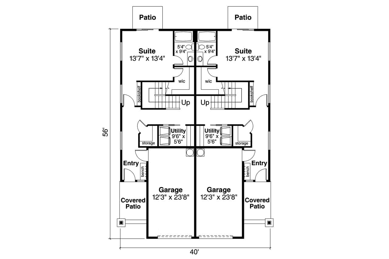 This duplex plan has two identical units. Each unit has 2472 living square feet, 5 bedrooms, 5 bathrooms, and 1 garage space.