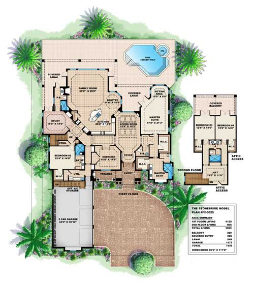 Luxury Home Plans Stonebridge Model are two story, Florida and Mediterranean house plans with 5025 total living square feet. It has 4 bedrooms, 4 bathrooms, and a 3 car garage. Some of the special features of this set of homeplans include a Study/Library, Open floor plan, Loft/Balcony, Family Room, and an Exercise Room.