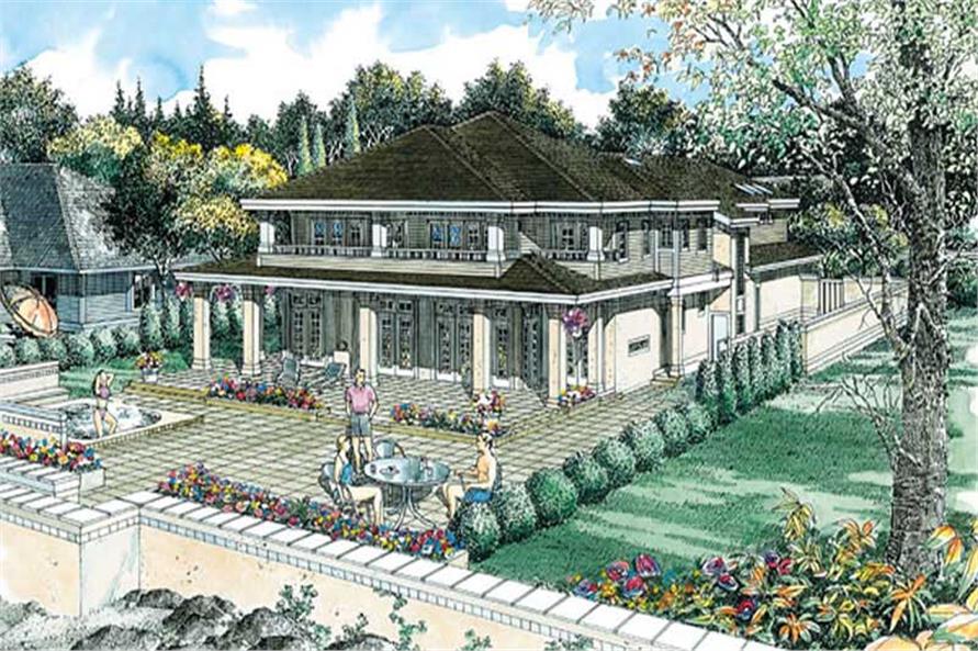 This unusual stucco-and-siding design for these house plans opens with a grand portico to a foyer that extends to the living room with a fireplace. Proceed up a few steps to the dining room with its coffered ceiling and butler's pantry.