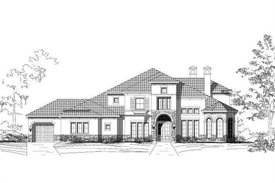 This two-story, luxury Tuscan-style home with stucco and cultured stone exterior as well as having 5179 total living square feet. It has 5 bedrooms, 4 baths, and a split front load 3 car garage. This house plan also has 2 living areas, 2 dining areas, a bar, a computer alcove, a covered side porch, an optional pool bath, a portico, a butler pantry, a covered rear porch, a master with sitting area, an outdoor kitchen, and a separate master closet.
