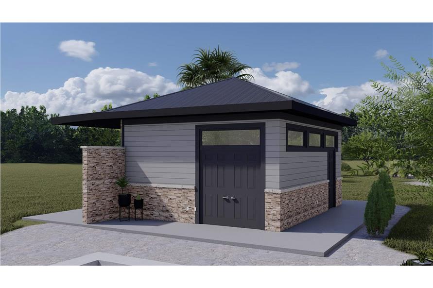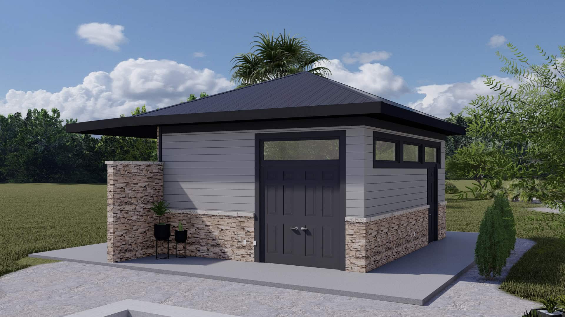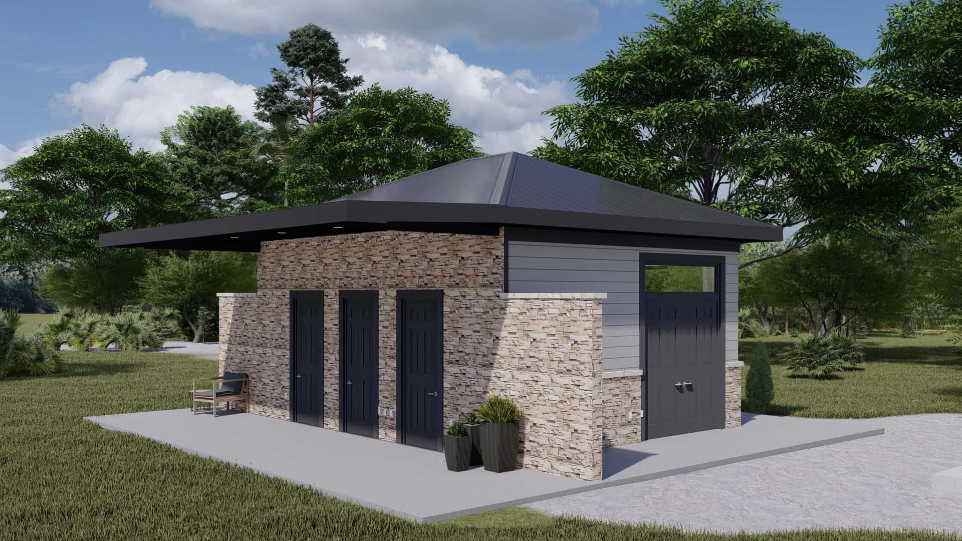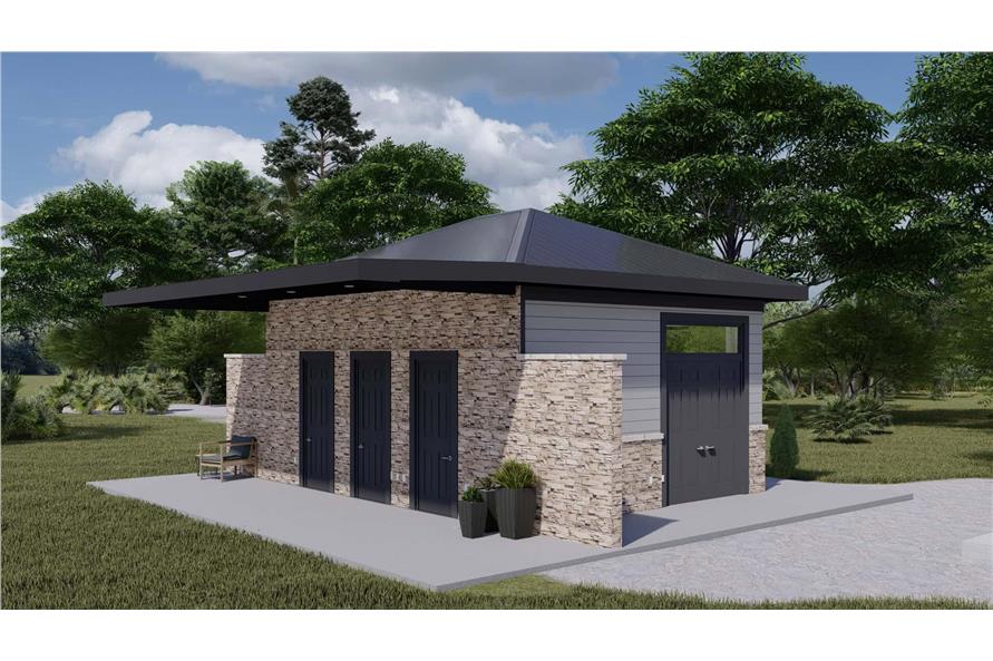 Transform your outdoor area with this 518 square feet Traditional style garage design, the perfect pool house for your home. It features a spacious storage room, a dedicated pool equipment room, a full bathroom, a changing room, and plenty of space for outdoor relaxation.