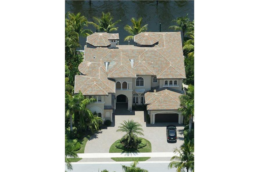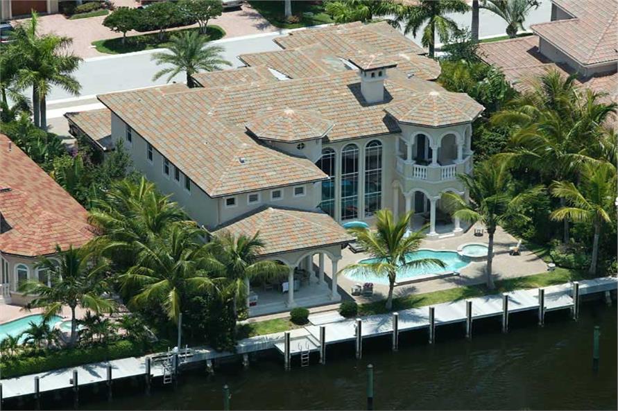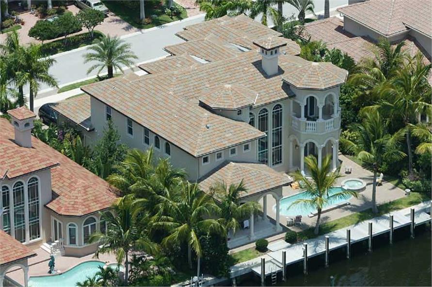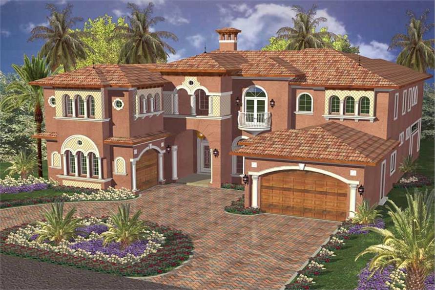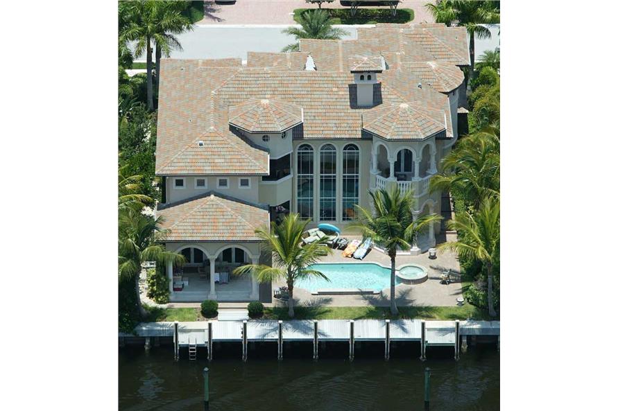 This beautiful, two-story, Spanish-style waterfront house plan features five bedrooms, four and one-half bathrooms, a cabana bath, two-car and a one-car garage, a covered entrance with displaying an eight-foot high French door and arched transom. Columns and arches make a majestic appearance. The interior and exterior of this home is truly luxurious. The first story provides a large living room with high ceiling and fireplace. A family room opens to a covered patio with summer kitchen. The designer island kitchen features an eating bar, cafe and pantry. The formal dining room has an arched...