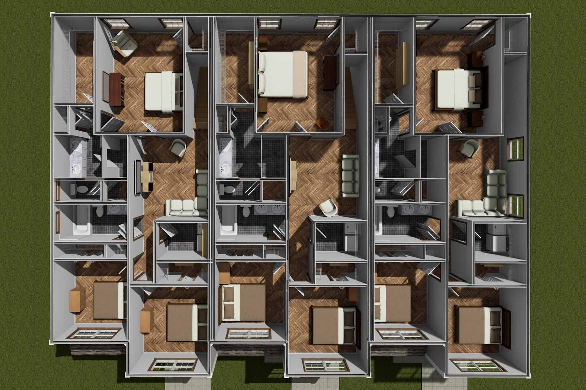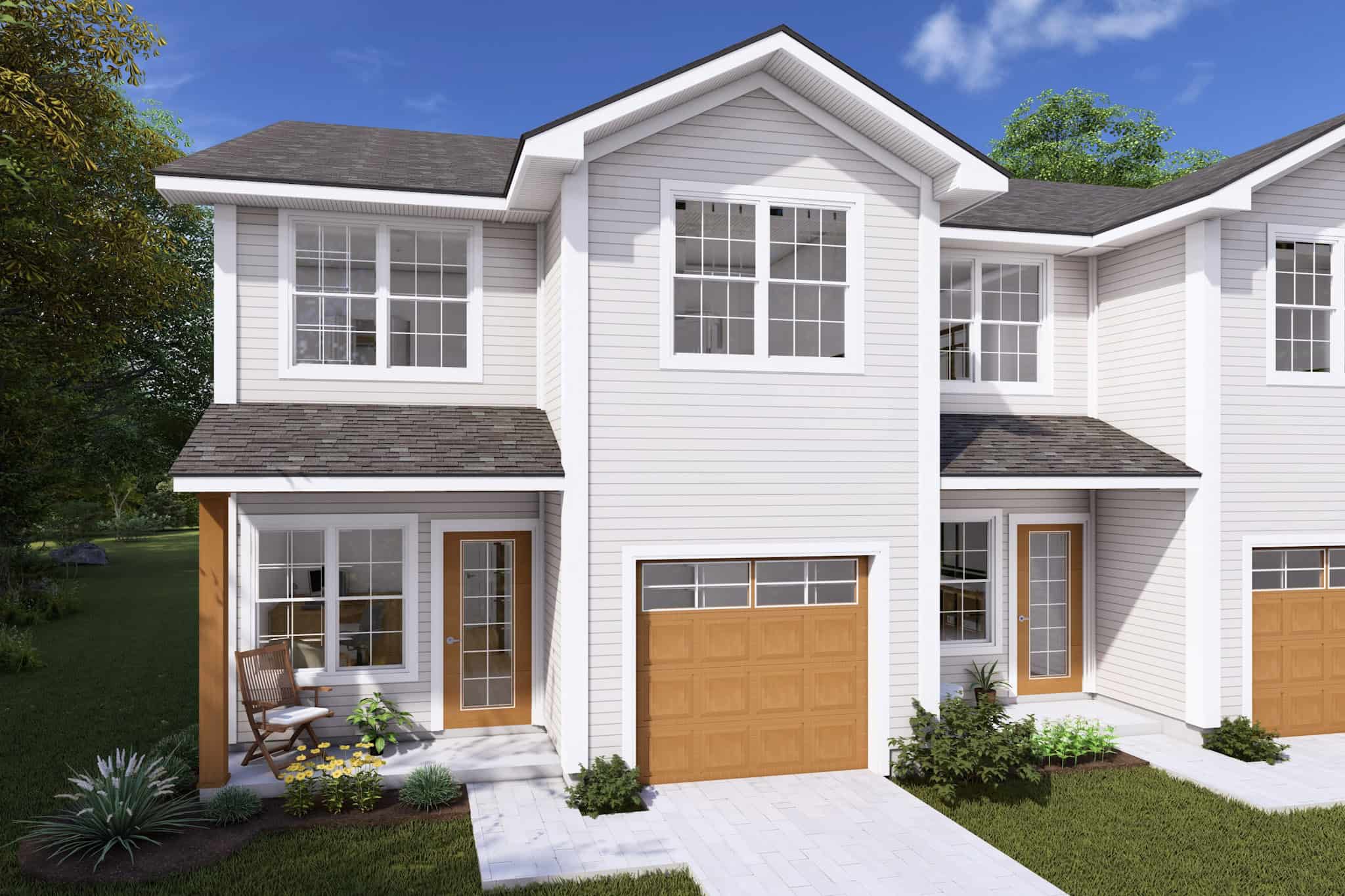 Duplex and Triplex Plans are Slab & 2x4 ONLY!! If you need to change either, please send in a modification request. This multi-family plan has two identical units. Each unit has 1,567 living square feet, 3 bedrooms, 2.5 baths, and 1 garage space.