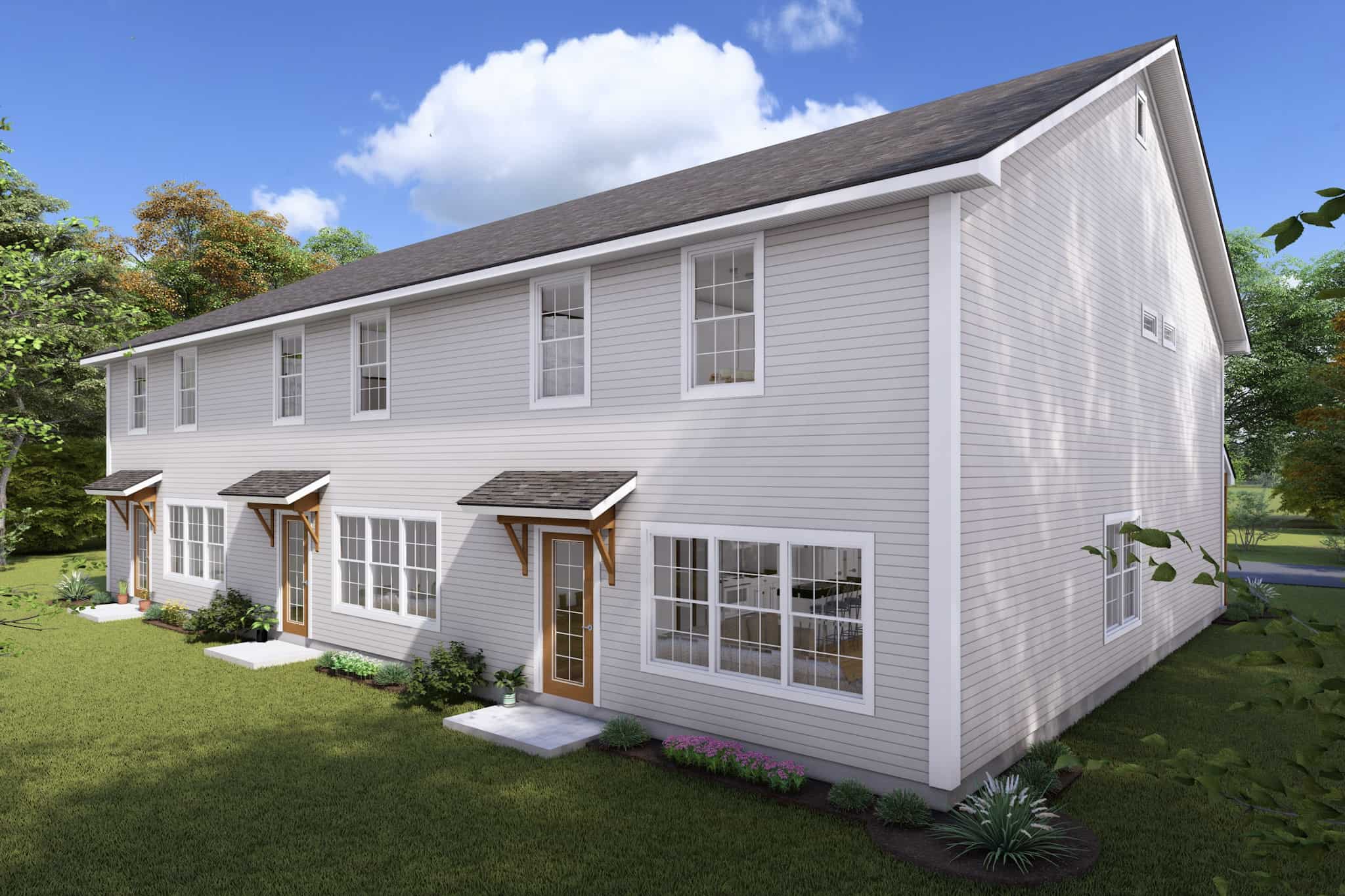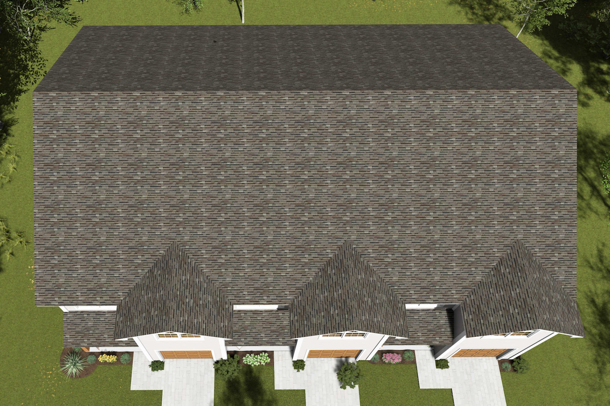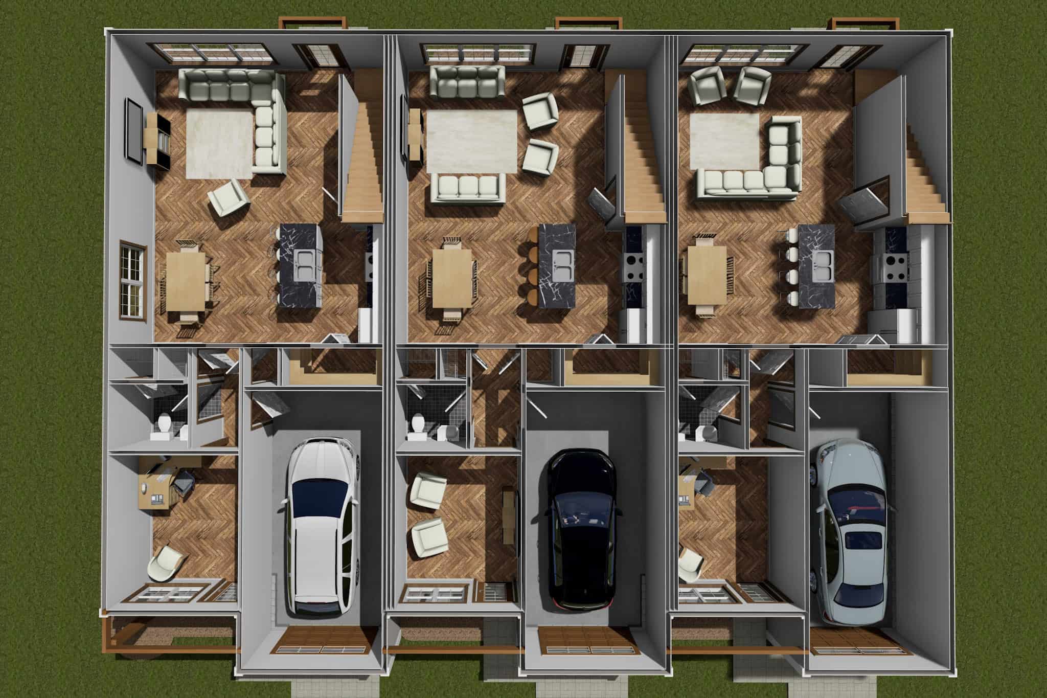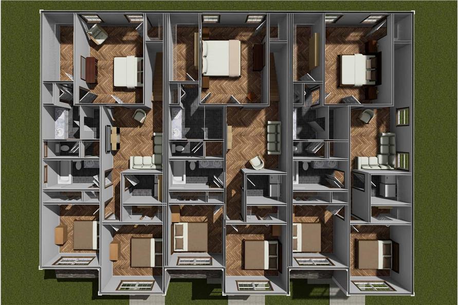 This multi-family plan has three identical units. Each unit has 1,853 living square feet, 3 bedrooms, 2.5 baths, and 1 garage space.