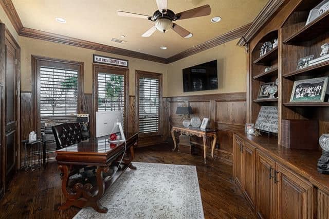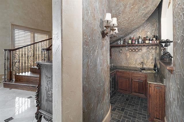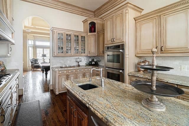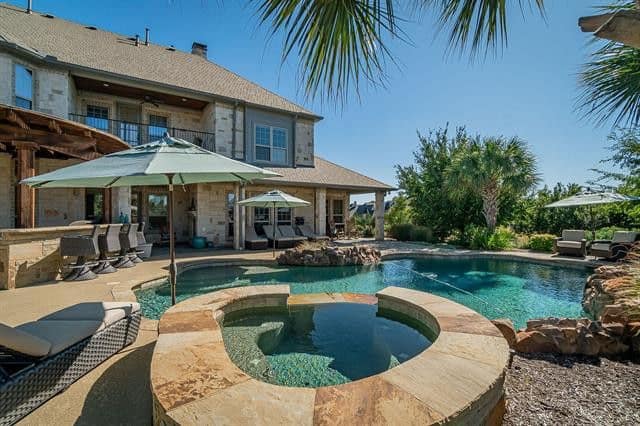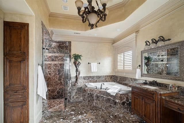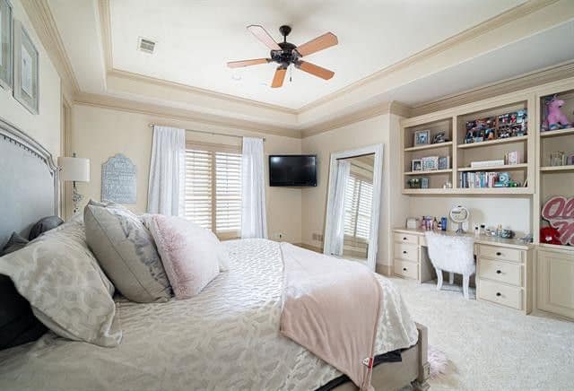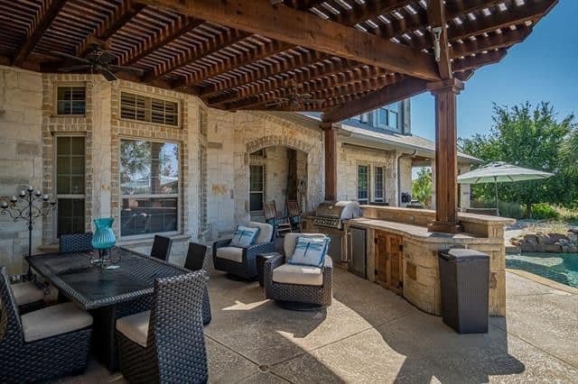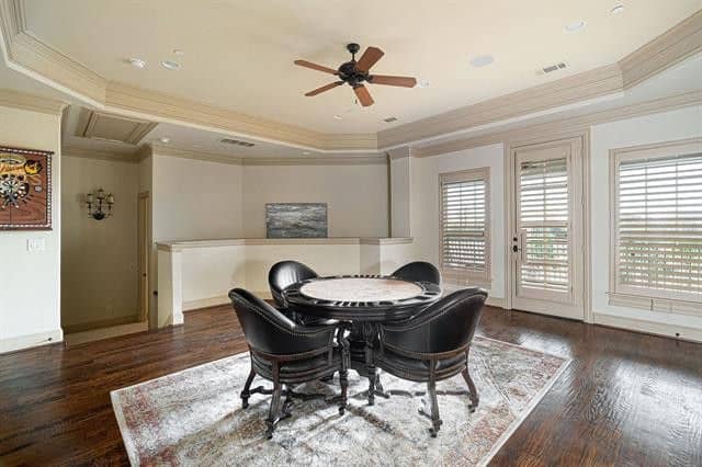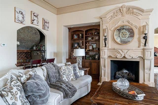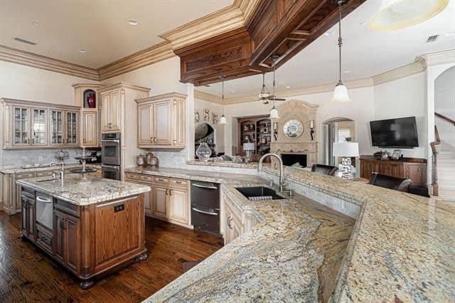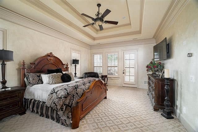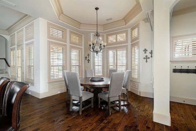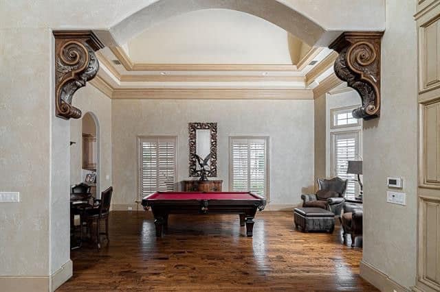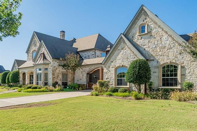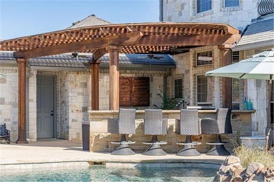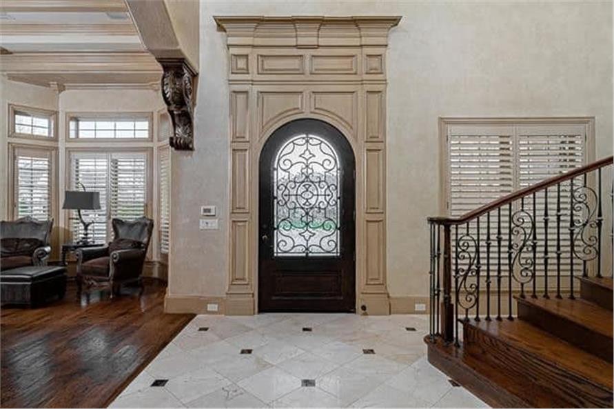 This lovely Tudor style home with European influences (House Plan #195-1125) has 5765 square feet of living space. The 2 story floor plan includes 5 bedrooms.