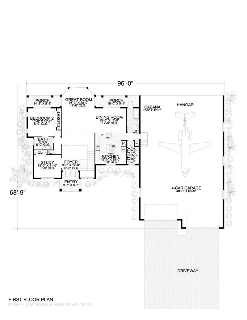 House Plan #107-1059 grabs your attention from the curb all the way through. Its large great room is flanked by a gorgeous covered patio. The master suite is truly luxurious with his and her walk-in closets and a stylish tray ceiling and regal master Bath. But the star attraction of this design is the aircraft hangar.