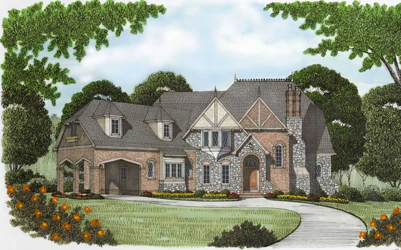 this impressive Tudor-style manor features elegance in a fairly open floor plan. The covered entry brings you in past the spiral staircase and formal dining room, into the gallery and great room beyond. The kitchen and informal dining area are to the left and the garage is beyond. A large fireplace warms the space and makes a great centerpiece. The master suite is secluded to the right with a gorgeous master bath and plenty of closet space. The quiet study is secluded behind the stairs and features a fireplace of its own. The upper floor is packed with more bedrooms, a media room, a game...