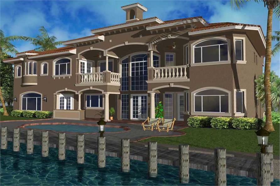 This is a two-story Luxurious, Mediterranean house plan with 6009 total living square feet. These home plans have 4 bedrooms, 5 bathrooms, and a 3-car garage. The foyer leads you into the large living room. To the left of the living room is a bedroom and the library. To the right is the kitchen and the dining and family rooms. The upper floor plan has the master bedroom, fully equipped with a balcony and sitting area. There are also two other bedrooms as well as a media room. This plan is as good as it gets for the Mediterranean style.