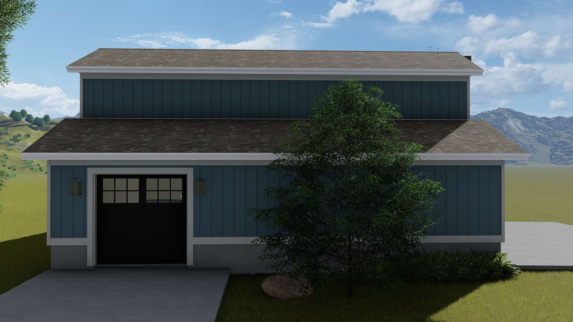 This adorable barndomium-style garage with an apartment plan is perfect as an addition to a home with 680 square feet of heated and cooled living space on the second level, with a bedroom, bathroom, and great room. The 1,280 square feet garage with a front and left side entrance has a lot of windows around that exude natural light.