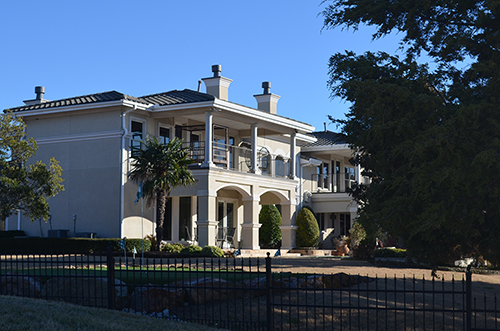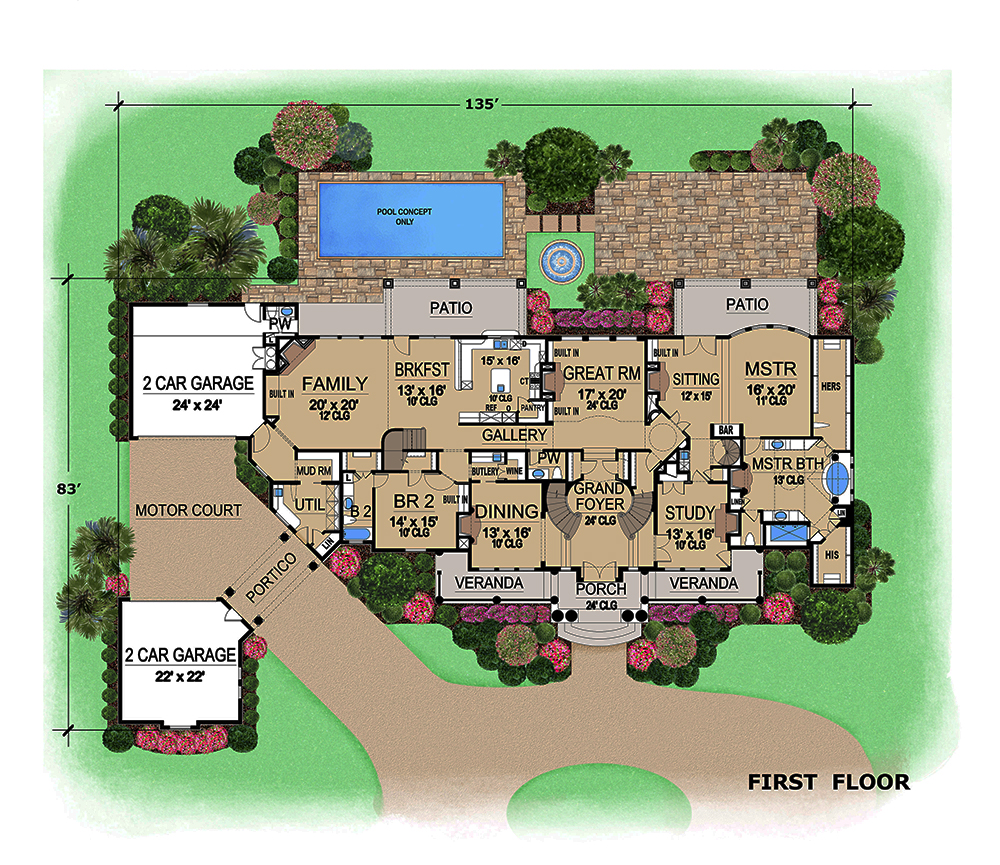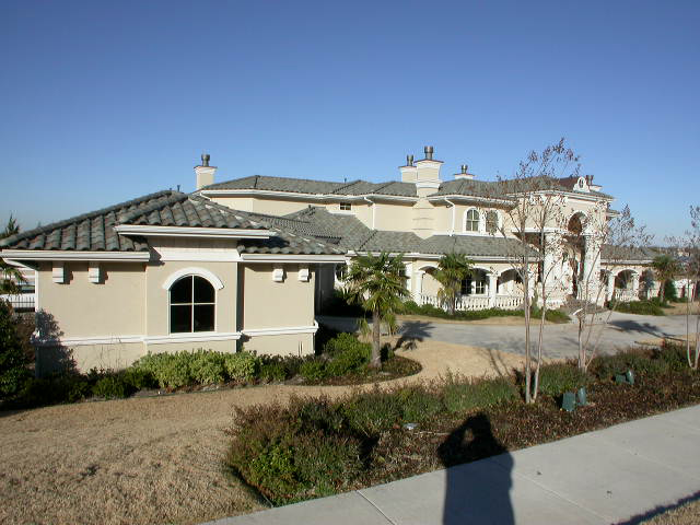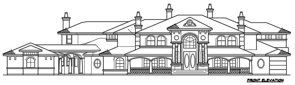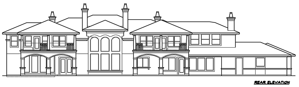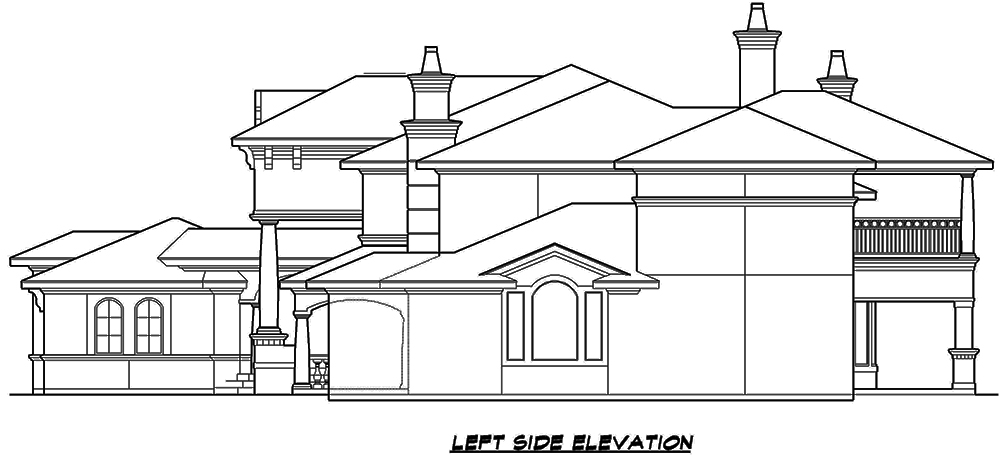 This lovely Mediterranean style home with Spanish influences (House Plan #195-1077) has 7215 square feet of living space. The 2 story floor plan includes 5 bedrooms.