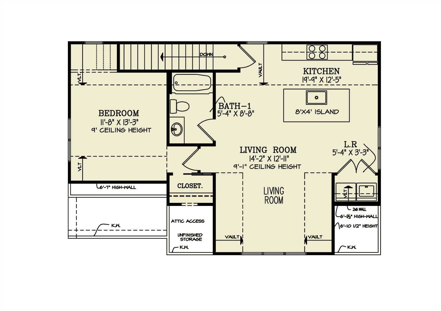 Showcasing classic Modern Farmhouse design, this 904-square-foot garage plan provides parking for up to two vehicles and features a highly adaptable layout, allowing for the addition of extra functional areas. Upstairs, the 765-square-foot conditioned living space includes a comfortable bedroom, a full bathroom, a walk-in closet, and a spacious Living Room.